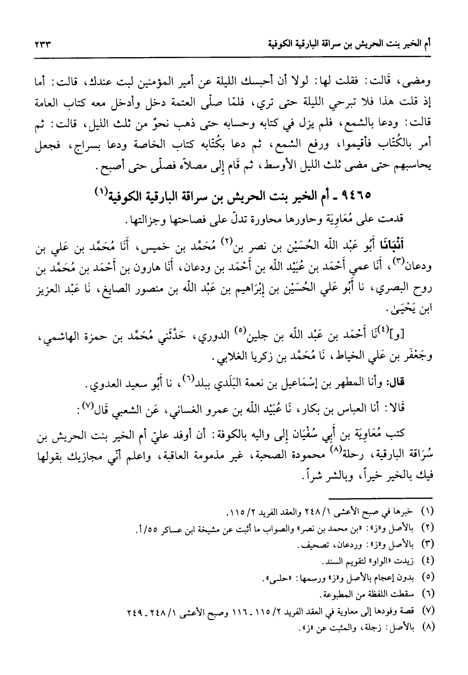 9465 - أم الخير بنت الحريش بن سراقة البارقية الكوفية (1) قدمت على معاوية وحاورها محاورة تدل على فصاحتها وجزالتها أنبأنا أبو عبد الله الحسين بن نصر بن (2) محمد بن خميس أنا محمد بن علي بن ودعان (3) أنا عمي أحمد بن عبيد الله بن أحمد بن ودعان أنا هارون بن أحمد بن محمد بن روح البصري نا أبو علي الحسين بن إبراهيم بن عبد الله بن منصور الصايغ نا عبد العزيز ابن يحيى [و] (4) نا أحمد بن عبد الله بن جلين (5) الدوري حدثني محمد بن حمزة الهاشمي وجعفر بن علي الخياط نا محمد بن زكريا الغلابي قال وأنا المطهر بن إسماعيل بن نعمة البلدي ببلد (6) نا أبو سعيد العدوي قالا أنا العباس بن بكار نا عبيد الله بن عمرو الغساني عن الشعبي قال (7) : كتب معاوية بن أبي سفيان إلى واليه بالكوفة أن أوفد علي أم الخير بنت الحريش بن سراقة البارقية رحلة (8) محمودة الصحبة غير مذمومة العاقبة واعلم أني مجازيك بقولها فيك بالخير خيرا وبالشر شرا