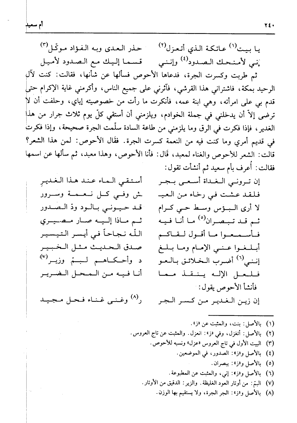 ثم طربت وكسرت الجرة فدعاها الأحوص فسألها عن شأنها فقالت كنت لآل الرحيد بمكة فاشتراني هذا القرشي فأثرني على جميع الناس وأكرمني غاية الإكرام حتى قدم بي على امرأته وهي ابنة عمه فأنكرت ما رأت من خصوصيته إياي وحلفت أن لا ترضى إلا أن يدخلني في جملة الخوادم ويلزمني أن أستقي كل يوم ثلاث جرار من هذا الغدير فإذا فكرت في الرق وما يلزمني من طاعة السادة سلمت الجرة صحيحة وإذا فكرت في قديم أمري وما كنت فيه من النعمة كسرت الجرة فقال الأحوص لمن هذا الشعر؟ قالت الشعر للأحوص والغناء لمعبد قال فأنا الأحوص وهذا معبد ثم سألها عن اسمها فقالت: أعرف بأم سعيد ثم أنشأت تقول: إن تروني الغداة أسعى بجر * أستقي الماء عند هذا الغدير فلقد عشت في رخاء من العي * ش وفي كل نعمة وسرور لا أرى البؤس وسط حي كرام * قد حيوني بالود ود الصدور ثم قد تبصران (5) ما أنا فيه * ثم ماذا إليه صار مصيري فأسمعوا ما أقول لقاكم * الله نجاحا في أيسر التيسير أبلغوا عني الإمام وما بلغ * صدق الحديث مثل الخبير إنني (6) أضرب الخلائق بالعو * د وأحكاهم لبم وزير (7) فلعل الإله ينقذ مما * أنا فيه من المحل الضرير