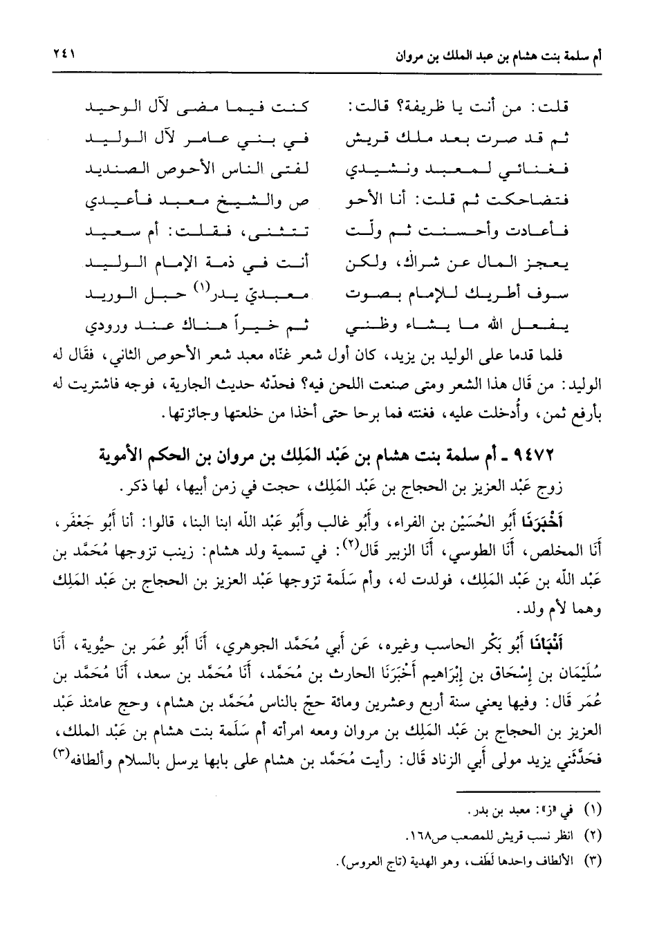 9472 - أم سلمة بنت هشام بن عبد الملك بن مروان بن الحكم الأموية زوج عبد العزيز بن الحجاج بن عبد الملك حجت في زمن أبيها لها ذكر أخبرنا أبو الحسين بن الفراء وأبو غالب وأبو عبد الله ابنا البنا قالوا أنا أبو جعفر أنا المخلص أنا لطوسي أنا الزبير قال (2) : في تسمية ولد هشام زينب تزوجها محمد بن عبد الله بن عبد الملك فولدت له وأم سلمة تزوجها عبد العزيز بن الحجاج بن عبد الملك وهما لأم ولد أنبأنا أبو بكر الحاسب وغيره عن أبي محمد الجوهري أنا أبو عمر بن حيوية أنا سليمان بن إبراهيم أخبرنا الحارث بن محمد أنا محمد بن سعد أنا محمد بن عمر قال وفيها يعني سنة أربع وعشرين ومائة حج بالناس محمد بن هشام وحج عامئذ عبد العزيز بن الحجاج بن عبد الملك بن مروان ومعه امرأته أم سلمة بنت هشام بن عبد الملك فحدثني يزيد مولى أبي الزناد قال رأيت محمد بن هشام على بابها يرسل بالسلام وألطافه (3)