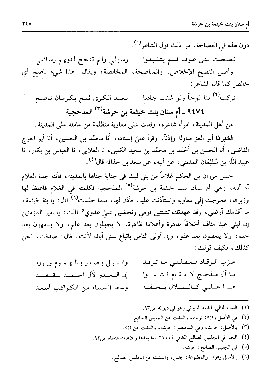 9474 - أم سنان بنت خيثمة بن حرشة (3) المذحجية من أهل المدينة امرأة شاعرة وفدت على معاوية متظلمة من عامله على المدينة أخبرنا أبو العز مناولة وإذنا وقرأ علي إسناده أنا محمد بن الحسين أنا أبو الفرج القاضي أنا الحسن بن أحمد بن محمد بن سعيد الكلبي نا الغلابي نا العباس بن بكار نا عبيد الله بن سليمان المديني عن أبيه عن سعد بن حذاقة قال (4) : حبس مروان بن الحكم غلاما من بيني ليث في جناية جناها بالمدينة فأتته جدة الغلام أم أبيه وهي أم سنان بنت خيثمة بن حرشة (5) المذحجية فكلمته في الغلام فأغلظ لها وزيرها فخرجت إلى معاوية واستأذنت عليه فأذن لها فلما جلست (6) قال يا بنة خيثمة ما أقدمك أرضي وقد عهدتك تشنئين قومي وتحضين علي عدوي قالت يا أمير المؤمنين إن لبني عبد مناف أخلاقا طاهرة وأعلاما ظاهرة لا يجهلون بعد علم ولا يسفهون بعد حلم ولا يتعقبون بعد عفو وإن أولى الناس باتباع سنن آبائه لأنت قال صدقت نحن كذلك فكيف قولك: عزب الرقاد فمقلتي ما ترقد * والليل يصدر بالهموم ويورد يا آل مذحج لا مقام فشمروا * إن العدو لآل أحمد يقصد هذا علي كالهلال يحفه * وسط السماء من الكواكب أسعد