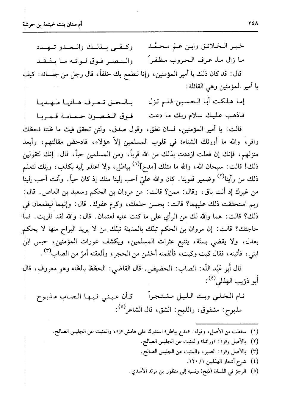 قالت يا أمير المؤمنين لسان نطق وقول صدق ولئن تحقق فيك ما ظننا فحظك وافر والله ما أورثك الشناءة في قلوب المسلمين إلا هؤلاء فادحض مقالتهم وأبعد منزلهم فإنك إن فعلت ازددت بذلك من الله قربا ومن المسلمين حبا قال إنك لتقولين ذلك قالت سبحان الله والله ما مثلك [مدح] (1) بباطل ولا اعتذر إليه بكذب وإنك لتعلم ذلك من رأينا (2) وضمير قلوبنا كان والله علي أحب إلينا منك إذ كان حيا وأنت أحب إلينا من غيرك إذ أنت باق وقال ممن؟ قالت من مروان بن الحكم وسعيد بن العاص قال وبم استحققت ذلك عليهما؟ قالت بحسن حلمك وكرم عفوك قال وإنهما ليطمعان في ذلك؟ قالت هما والله لك من الرأي على ما كنت عليه لعثمان قال والله لقد قاربت فما حاجتك؟ قالت إن مروان بن الحكم تبنك بالمدينة تبنك من لا يريد البراح منها لا يحكم بعدل ولا يقضي بسنة يتتبع عثرات المسلمين ويكشف عورات المؤمنين حبس ابن ابني فأتيته فقال كيت وكيت فألقمته أخشن من الحجر وألعقته أمر من الصاب (3) قال أبو عبد الله الصاب الحضيض قال القاضي الحظظ بالظاء وهو معروف قال أبو ذؤيب الهذلي (4) : نام الخلي وبت الليل مشتجرا * كأن عيني فيها الصاب مذبوح