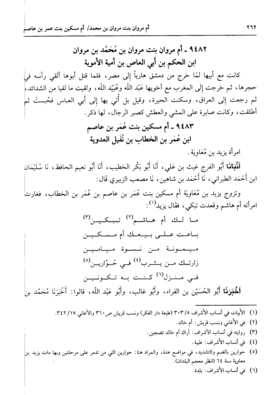 9482 - أم مروان بنت مروان بن محمد بن مروان ابن الحكم بن أبي العاص بن أمية الأموية كانت مع أبيها لما خرج من دمشق هاربا إلى مصر فلما قتل أبوها ألقي رأسه في حجرها ثم خرجت إلى المغرب مع أخويها عبد الله وعبيد الله ولقيت ما لقيا من الشدائد ثم رجعت إلى العراق وسكنت الحيرة وقيل بل أتي بها إلى أبي العباس فحبست ثم أطلقت وكانت صابرة على المشي والعطش كصبر الرجال لها ذكر 9483 أم مسكين بنت عمر بن عاصم ابن عمر بن الخطاب بن نفيل العدوية امرأة يزيد بن معاوية أنبأنا أبو الفرج غيث بن علي أنا أبو بكر الخطيب أنا أبو نعيم الحافظ نا سليمان ابن أحمد الطبراني نا أحمد بن شاهين نا مصعب الزبيري قال: وتزوج يزيد بن معاوية أم مسكين بنت عمر بن عاصم بن عمر بن الخطاب فغارت امرأته أم هاشم وقعدت تبكي فقال يزيد (1) : مالك أم هاشم (2) تبكين (3) باعت على بيعك أم مسكين ميمونة من نسوة ميامين زارتك من يثرب (4) في حوارين (5) في منزل (6) كنت به تكونين