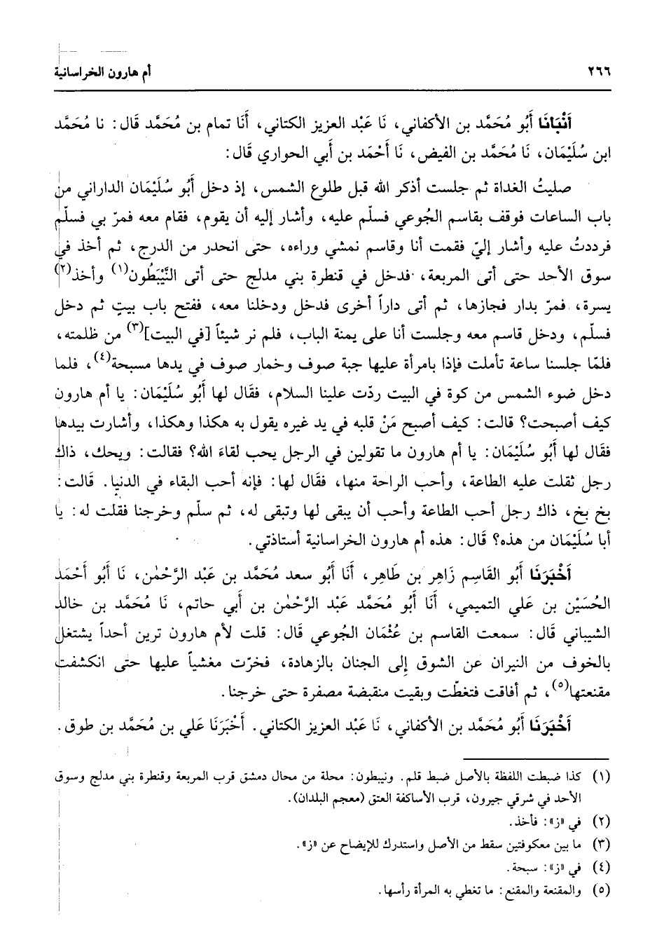 أنبأنا أبو محمد بن الأكفاني نا عبد العزيز الكتاني أنا تمام بن محمد قال نا محمد ابن سليمان نا محمد بن الفيض نا أحمد بن أبي الحواري قال: صليت الغداة ثم جلست أذكر الله قبل طلوع الشمس إذ دخل أبو سليمان الداراني من باب الساعات فوقف بقاسم الجوعي فسلم عليه وأشار إليه أن يقوم فقام معه فمر بي فسلم فرددت عليه وأشار إلي فقمت أنا وقاسم نمشي وراءه حتى انحدر من الدرج ثم أخذ في سوق الأحد حتى أتى المربعة فدخل في قنطرة بني مدلج حتى أتى النيبطون (1) وأخذ (2) يسرة فمر بدار فجازها ثم أتى دارا أخرى فدخل ودخلنا معه ففتح باب بيت ثم دخل فسلم ودخل قاسم معه وجلست أنا على يمنة الباب فلم نر شيئا [في البيت] (3) من ظلمته فلما جلسنا ساعة تأملت فإذا بامرأة عليها جبة صوف وخمار صوف في يدها مسبحة (4) فلما دخل ضوء الشمس من كوة في البيت ردت علينا السلام فقال لها أبو سليمان يا أم هارون كيف أصبحت؟ قالت كيف أصبح من قلبه في يد غيره يقول به هكذا وهكذا وأشارت بيدها فقال لها أبو سليمان يا أم هارون ما تقولين في الرجل يحب لقاء الله فقالت ويحك ذاك رجل ثقلت عليه الطاعة وأحب الراحة منها فقال لها فإنه أحب البقاء في الدنيا قالت بخ بخ ذاك رجل أحب الطاعة وأحب أن يبقى لها وتبقى له ثم سلم وخرجنا فقلت له يا أبا سليمان من هذه قال هذه أم هارون الخراسانية أستاذتي أخبرنا أبو القاسم زاهر بن طاهر أنا أبو سعد محمد بن عبد الرحمن نا أبو أحمد الحسين بن علي التميمي أنا أبو محمد عبد الرحمن بن أبي حاتم نا محمد بن خالد الشيباني قال سمعت القاسم بن عثمان الجوعي قال قلت لأم هارون ترين أحدا يشتغل بالخوف من النيران عن الشوق إلى الجنان بالزهادة فخرت مغشيا عليها حتى انكشفت مقنعتها (5) ثم أفاقت فتغطت وبقيت منقبضة مصفرة حتى خرجنا أخبرنا أبو محمد بن الأكفاني نا عبد العزيز الكتاني أخبرنا علي بن محمد بن طوق