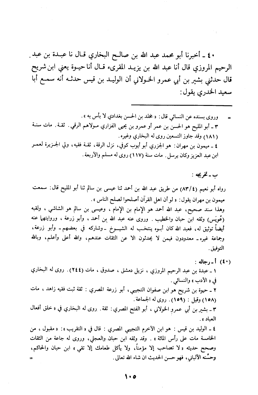 40 - أَخْبَرَنَا أَبُو مُحَمَّدٍ عَبْدُ اللَّهِ بْنُ صَالِحٍ الْبُخَارِيُّ , قَالَ: نا عَبْدَةُ بْنُ عَبْدِ الرَّحِيمِ الْمَرْوَزِيُّ قَالَ: أنا عَبْدُ اللَّهِ بْنُ يَزِيدَ الْمُقْرِئُ , قَالَ: أنا حَيْوَةُ يَعْنِي ابْنَ شُرَيْحٍ , قَالَ: حَدَّثَنِي بَشِيرُ بْنُ أَبِي عَمْرٍو الْخَوْلَانِيُّ أَنَّ الْوَلِيدَ بْنَ قَيْسٍ , حَدَّثَهُ أَنَّهُ سَمِعَ أَبَا سَعِيدٍ الْخُدْرِيَّ , يَقُولُ: سَمِعْتُ رَسُولَ اللَّهِ صَلَّى اللهُ عَلَيْهِ وَسَلَّمَ يَقُولُ: " §-[106]- يَكُونُ خَلْفٌ بَعْدَ سِنِينَ أَضَاعُوا الصَّلَاةَ وَاتَّبَعُوا الشَّهَوَاتِ فَسَوْفَ يَلْقَونَ غَيًّا , ثُمَّ يَكُونُ خَلْفٌ يَقْرَءُونَ الْقُرْآنَ لَا يَعْدُو تَرَاقِيَهُمْ , وَيَقْرَأُ الْقُرْآنَ ثَلَاثَةٌ: مُؤْمِنٌ وَمُنَافِقٌ وَفَاجِرٌ " , فَقَالَ بَشِيرٌ: فَقُلْتُ لِلْوَلِيدِ: مَا هَؤُلَاءِ الثَّلَاثَةُ؟ فَقَالَ: الْمُنَافِقُ كَافِرٌ بِهِ , وَالْفَاجِرُ يَتَآكَلُ بِهِ , وَالْمُؤْمِنُ مُؤْمِنٌ بِهِ "