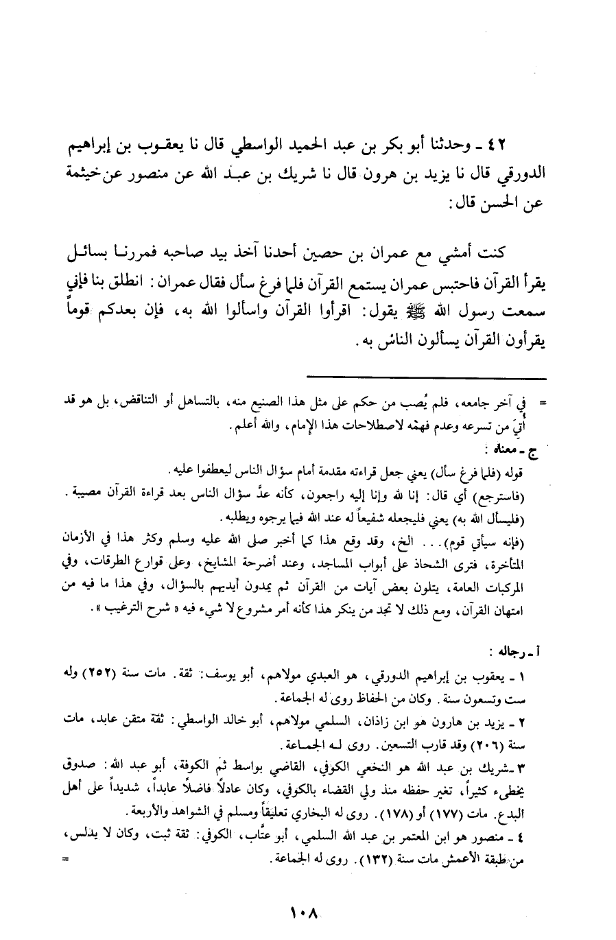 42 - وَحَدَّثَنَا أَبُو بَكْرِ بْنُ عَبْدِ الْحَمِيدِ الْوَاسِطِيُّ , قَالَ: نا يَعْقُوبُ بْنُ إِبْرَاهِيمَ الدَّوْرَقِيُّ قَالَ: نا يَزِيدُ بْنُ هَارُونَ قَالَ: نا شَرِيكُ بْنُ عَبْدِ اللَّهِ عَنْ مَنْصُورٍ , عَنْ خَيْثَمَةَ , عَنِ الْحَسَنِ , قَالَ: كُنْتُ أَمْشِي مَعَ عِمْرَانَ بْنِ الْحُصَيْنِ , أَحَدُنَا آخِذٌ بِيَدِ صَاحِبِهِ , فَمَرَرْنَا بِسَائِلٍ يَقْرَأُ الْقُرْآنَ , فَاحْتَبَسَ عِمْرَانُ يَسْتَمِعُ الْقُرْآنَ , فَلَمَّا فَرَغَ سَأَلَ , فَقَالَ عِمْرَانُ: انْطَلِقْ بِنَا إِنِّي سَمِعْتُ رَسُولَ اللَّهِ صَلَّى اللهُ عَلَيْهِ وَسَلَّمَ يَقُولُ: «§اقْرَءُوا الْقُرْآنَ وَاسْأَلُوا اللَّهَ بِهِ , فَإِنَّ بَعْدَكُمْ قَوْمًا يَقْرَءُونَ الْقُرْآنَ، يَسْأَلُونَ النَّاسَ بِهِ» . (¬1)