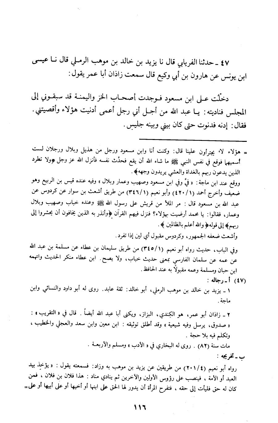 47 - حَدَّثَنَا الْفِرْيَابِيُّ , قَالَ: نا يَزِيدُ بْنُ خَالِدِ بْنِ مُوهِبٍ الرَّمْلِيُّ قَالَ: نا عِيسَى بْنُ يُونُسَ , عَنْ هَارُونَ بْنِ أَبِي وَكِيعٍ قَالَ: سَمِعْتُ زَاذَانَ أَبَا عُمَرَ يَقُولُ: دَخَلْتُ عَلَى ابْنِ مَسْعُودٍ: فَوَجَدْتُ أَصْحَابَ الْخَزِّ وَالْيُمْنَةِ قَدْ سَبَقُونِي إِلَى الْمَجْلِسِ , فَنَادَيْتُهُ: يَا عَبْدَ اللَّهِ , مِنْ أَجْلِ أَنِّي رَجُلٌ أَعْمَى أَدْنَيْتَ هَؤُلَاءِ وَأَقْصَيْتَنِي؟ فَقَالَ: ادْنُهْ , قَدْ §دَنَوْتُ حَتَّى كَانَ بَيْنِي وَبَيْنَهُ جَلِيسٌ " -[117]- قَالَ مُحَمَّدُ بْنُ الْحُسَيْنِ: وَأُحِبُّ لَهُ إِذَا جَاءَ مَنْ يُرِيدُ أَنْ يَقْرَأَ عَلَيْهِ مِنْ صَغِيرٍ أَوْ حَدَثٍ أَوْ كَبِيرٍ أَنْ يَعْتَبِرَ كُلَّ وَاحِدٍ مِنْهُمْ قَبْلَ أَنْ يُلَقِّنَهُ مِنْ سُورَةِ الْبَقَرَةِ، يَعْتَبِرُهُ بِأَنْ يَعْرِفَ مَا مَعَهُ مِنَ الْحَمْدِ , إِلَى مِقْدَارِ رُبُعِ سُبُعٍ أَوْ أَكْثَرَ مِمَّا يُؤَدِّي بِهِ صَلَاتَهُ , وَيَصْلُحُ أَنْ يَؤُمَّ بِهِ فِي الصَّلَوَاتِ إِذَا احْتَاجَ إِلَيْهِ , فَإِنْ كَانَ يُحْسِنُهُ وَكَانَ تَعَلُّمُهُ فِي الْكُتَّابِ أَصْلَحَ مِنْ لِسَانِهِ وَقَوَّمَهُ , حَتَّى يَصْلُحَ أَنْ يُؤَدِّيَ بِهِ فَرَائِضَهُ ثُمَّ يَبْتَدِئُ فَيُلَقِّنُهُ مِنْ سُورَةِ الْبَقَرَةِ وَأُحِبُّ لِمَنْ يُلَقَّنُ إِذَا قُرِئَ عَلَيْهِ أَنْ يُحْسِنَ الِاسْتِمَاعَ إِلَى مَنْ يَقْرَأُ عَلَيْهِ , وَلَا يَشْتَغِلَ عَنْهُ بِحَدِيثٍ وَلَا غَيْرِهِ , فَبِالْحَرِيِّ أَنْ يَنْتَفِعَ بِهِ مَنْ يَقْرَأُ عَلَيْهِ , وَكَذَلِكَ يَنْتَفِعُ هُوَ أَيْضًا , وَيَتَدَبَّرُ مَا يَسْمَعُ مِنْ غَيْرِهِ , وَرُبَّمَا كَانَ سَمَاعُهُ لِلْقُرْآنِ مِنْ غَيْرِهِ لَهُ فِيهِ زِيَادَةُ مَنْفَعَةٍ وَأَجْرٌ عَظِيمٌ , وَيَتَنَاوَلَ قَوْلَ اللَّهِ عَزَّ وَجَلَّ: {وَإِذَا قُرِئَ الْقُرْآنُ فَاسْتَمِعُوا -[118]- لَهُ وَأَنْصِتُوا لَعَلَّكُمْ تُرْحَمُونَ} [الأعراف: 204] فَإِذَا لَمْ يَتَحَدَّثْ مَعَ غَيْرِهِ وَأَنْصَتَ إِلَيْهِ أَدْرَكَتْهُ الرَّحْمَةُ مِنَ اللَّهِ , وَكَانَ أَنْفَعَ لِلْقَارِئِ عَلَيْهِ وَقَدْ قَالَ النَّبِيُّ صَلَّى اللهُ عَلَيْهِ وَسَلَّمَ لِعَبْدِ اللَّهِ بْنِ مَسْعُودٍ: «اقْرَأْ عَلَيَّ» , قَالَ: فَقُلْتُ: يَا رَسُولَ اللَّهِ , أَقْرَأُ عَلَيْكَ وَعَلَيْكَ أُنْزِلَ؟ , قَالَ: «إِنِّي أُحِبُّ أَنْ أَسْمَعَهُ مِنْ غَيْرِي»
