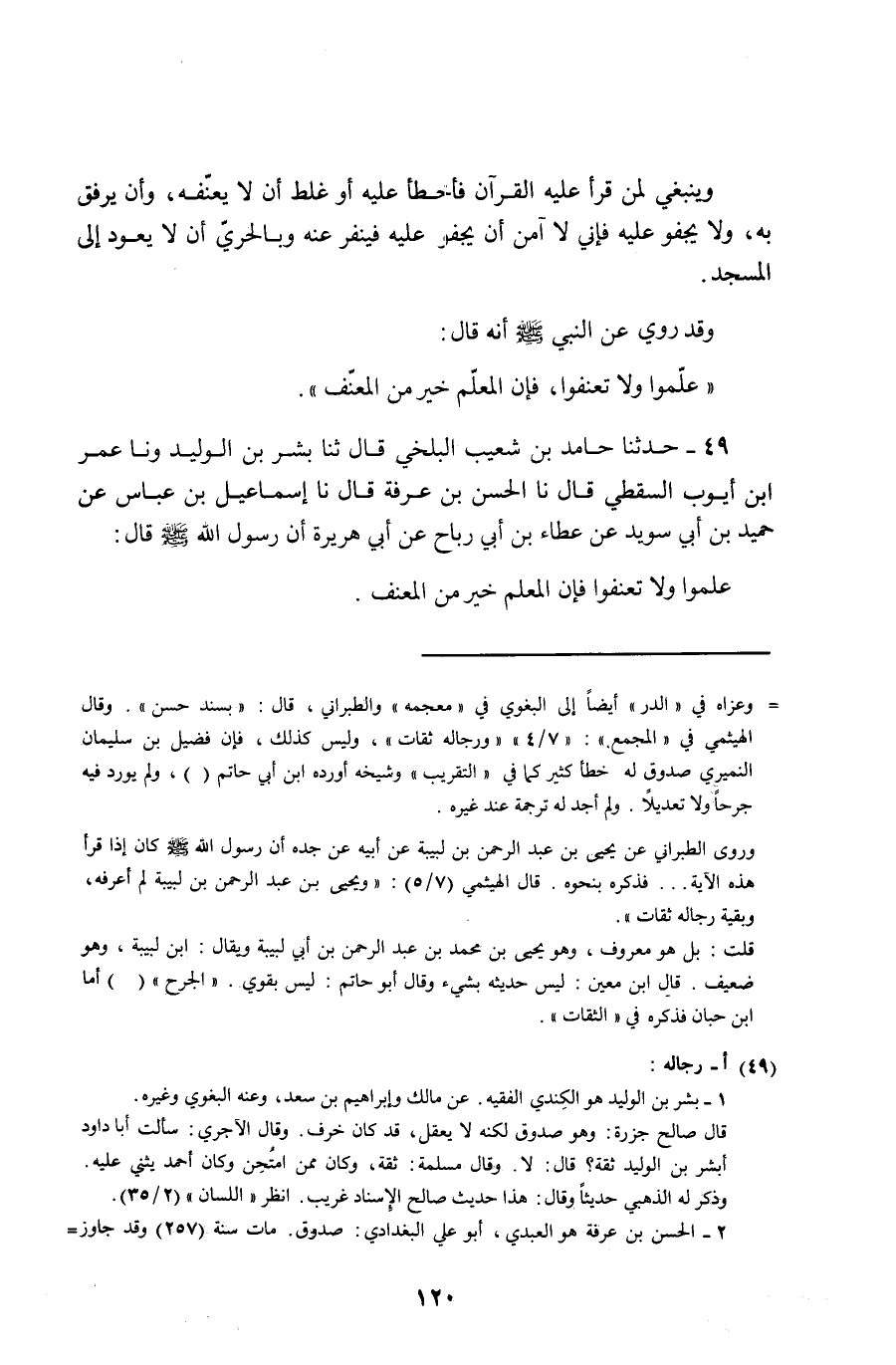 49 - وَحَدَّثَنَا حَامِدُ بْنُ شُعَيْبٍ الْبَلْخِيُّ قَالَ: نا بِشْرُ بْنُ الْوَلِيدِ , ونا عُمَرُ بْنُ أَيُّوبَ السَّقَطِيُّ قَالَ: نا الْحَسَنُ بْنُ عَرَفَةَ , قَالَ: نا إِسْمَاعِيلُ بْنُ عَيَّاشٍ , عَنْ حُمَيْدِ بْنِ أَبِي سُوَيْدٍ , عَنْ عَطَاءِ بْنِ أَبِي رَبَاحٍ , عَنْ أَبِي هُرَيْرَةَ , أَنَّ رَسُولَ اللَّهِ صَلَّى اللهُ عَلَيْهِ وَسَلَّمَ قَالَ: «§عَلِّمُوا وَلَا تُعَنِّفُوا فَإِنَّ الْمُعَلِّمَ خَيْرٌ مِنَ الْمُعَنِّفِ» (¬1) .