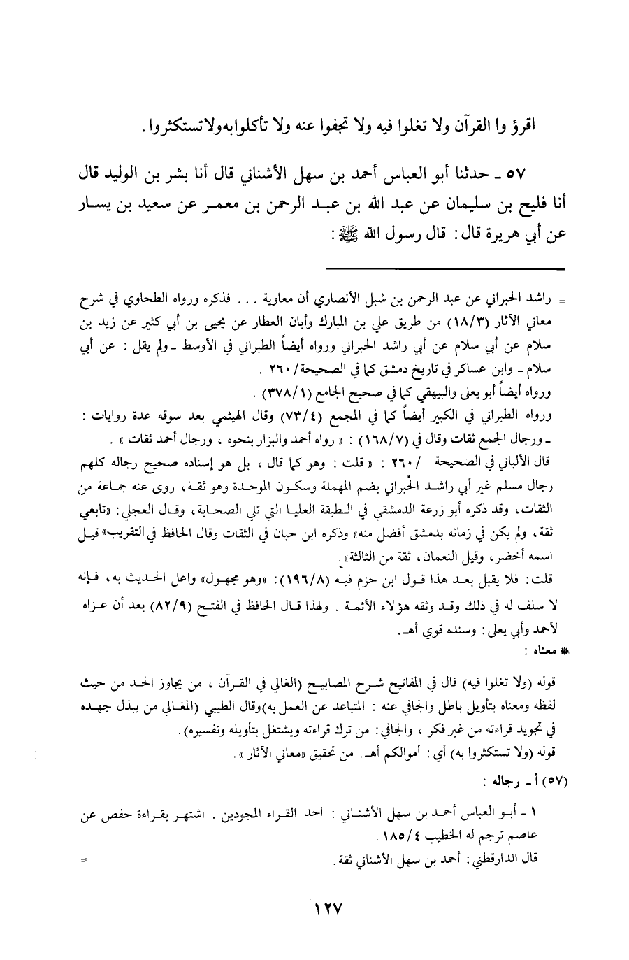57 - حَدَّثَنَا أَبُو الْعَبَّاسِ أَحْمَدُ بْنُ سَهْلٍ الْأُشْنَانِيُّ قَالَ: نا بِشْرُ بْنُ الْوَلِيدِ , قَالَ لَنَا فُلَيْحُ بْنُ سُلَيْمَانَ , عَنْ عَبْدِ اللَّهِ بْنِ عَبْدِ الرَّحْمَنِ بْنِ مَعْمَرٍ , عَنْ سَعِيدِ بْنِ يَسَارٍ , عَنْ أَبِي هُرَيْرَةَ , قَالَ: قَالَ رَسُولُ اللَّهِ صَلَّى اللهُ عَلَيْهِ وَسَلَّمَ: «§-[128]- مَنْ تَعَلَّمَ عِلْمًا مِمَّا يُبْتَغَى بِهِ وَجْهُ اللَّهِ لَا يَتَعَلَّمُهُ إِلَّا لِيُصِيبَ بِهِ عَرَضًا مِنَ الدُّنْيَا لَمْ يَجِدْ غُرُفَاتِ الْجَنَّةِ يَوْمَ الْقِيَامَةِ»
