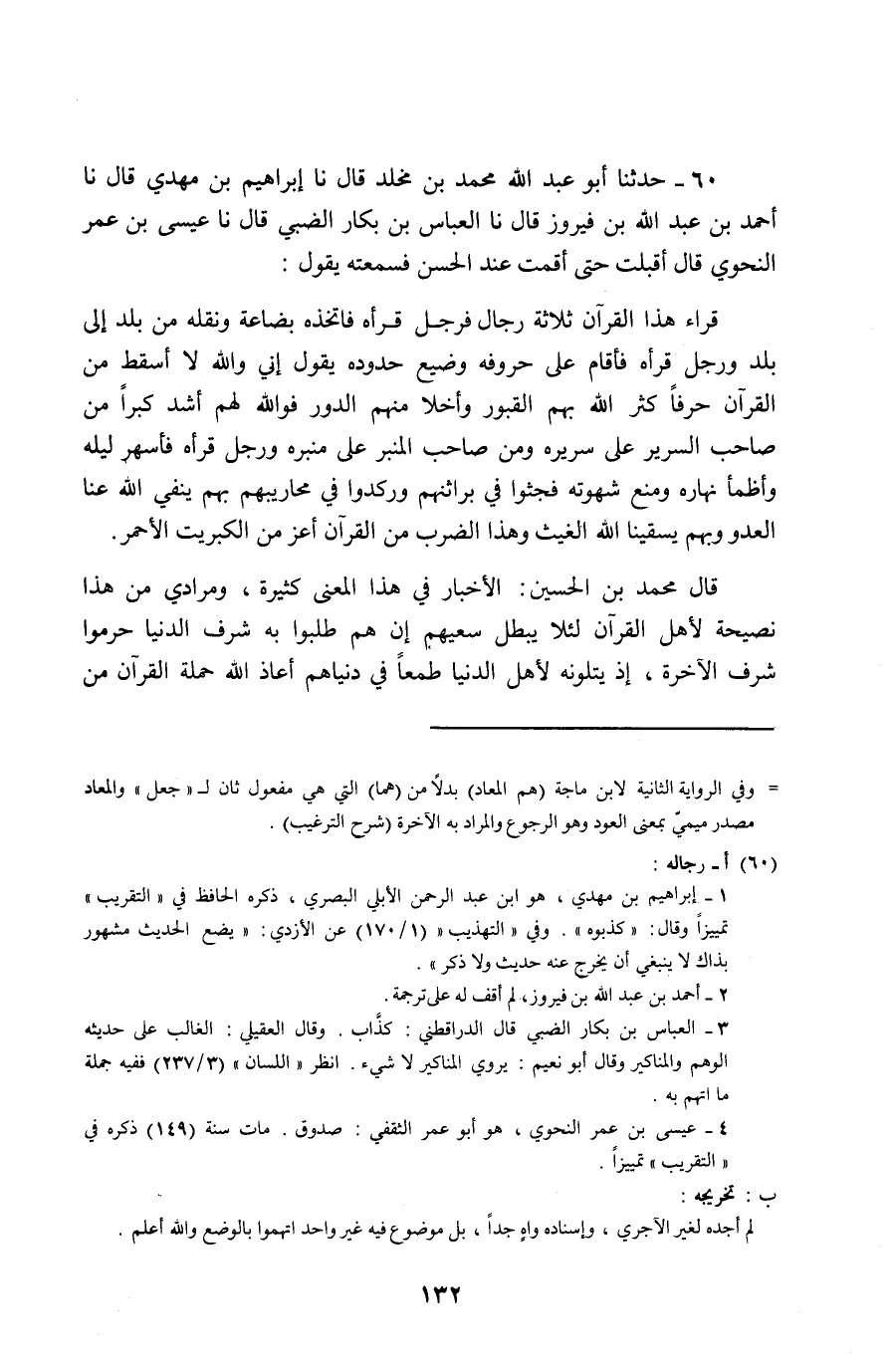 60 - حَدَّثَنَا أَبُو عَبْدِ اللَّهِ مُحَمَّدُ بْنُ مَخْلَدٍ قَالَ: نا إِبْرَاهِيمُ بْنُ مَهْدِيٍّ قَالَ: نا أَحْمَدُ بْنُ عَبْدِ اللَّهِ فَيْرُوزُ قَالَ , نا الْعَبَّاسُ بْنُ بَكَّارٍ الضَّبِّيُّ , قَالَ: نا عِيسَى بْنُ عُمَرَ النَّحْوِيُّ قَالَ: أَقْبَلْتُ حَتَّى أَقَمْتُ عِنْدَ الْحَسَنِ فَسَمِعْتُهُ يَقُولُ: §قَرَأَ هَذَا الْقُرْآنَ ثَلَاثَةُ رِجَالٍ: فَرَجُلٌ قَرَأَهُ فَاتَّخَذَهُ بِضَاعَةً وَنَقَلَهُ مِنْ بَلَدٍ إِلَى بَلَدٍ , وَرَجُلٌ قَرَأَهُ فَأَقَامَ عَلَى حُرُوفِهِ , وَضَيَّعَ حُدُودَهُ يَقُولُ: إِنِّي وَاللَّهِ لَا أُسْقِطُ مِنَ الْقُرْآنِ حَرْفًا , كَثَّرَ اللَّهُ بِهِمُ الْقُبُورَ , وَأَخْلَى مِنْهُمُ الدُّورَ فَوَاللَّهِ لَهُمْ أَشَدُّ كِبْرًا مِنْ صَاحِبِ السَّرِيرِ عَلَى سَرِيرِهِ , وَمِنْ صَاحِبِ الْمِنْبَرِ عَلَى مِنْبَرِهِ , وَرَجُلٌ قَرَأَهُ فَأَسْهَرَ لَيْلَهُ وَأَظْمَأَ نَهَارَهُ وَمَنَعَ شَهْوَتَهُ , فَجَثَوْا فِي بَرَاثِنِهِمْ وَرَكَدُوا فِي مَحَارِبِهِمْ , بِهِمْ يَنْفِي اللَّهُ عَنَّا الْعَدُوَّ وَبِهِمْ يَسْقِينَا اللَّهُ الْغَيْثَ , وَهَذَا الدَّرْبُ مِنَ الْقُرَّاءِ أَعَزُّ مِنَ الْكِبْرِيتِ الْأَحْمَرِ " قَالَ مُحَمَّدُ بْنُ الْحُسَيْنِ: الْأَخْبَارُ فِي هَذَا الْمَعْنَى كَثِيرَةٌ وَمُرَادِي مِنْ هَذَا نَصِيحَةٌ لِأَهْلِ الْقُرْآنِ لِئَلَّا يَبْطُلَ سَعْيُهُمْ , إِنْ هُمْ طَلَبُوا بِهِ شَرَفَ الدُّنْيَا حُرِمُوا شَرَفَ الْآخِرَةِ , إِذْ يَتْلُونَهُ لِأَهْلِ الدُّنْيَا طَمَعًا فِي دُنْيَاهُمْ , أَعَاذَ اللَّهُ حَمَلَةَ الْقُرْآنِ مِنْ -[133]- ذَلِكَ , فَيَنْبَغِي لِمَنْ يَجْلِسُ يُقْرِئُ الْمُسْلِمِينَ أَنْ يَتَأَدَّبَ بِأَدَبِ الْقُرْآنِ يَقْتَضِي ثَوَابَهُ مِنَ اللَّهِ عَزَّ وَجَلَّ , يَسْتَغْنِي بِالْقُرْآنِ عَنْ كُلِّ أَحَدٍ مِنَ الْخَلْقِ , مُتَوَاضِعٌ فِي نَفْسِهِ لِيَكُونَ رَفِيعًا عِنْدَ اللَّهِ