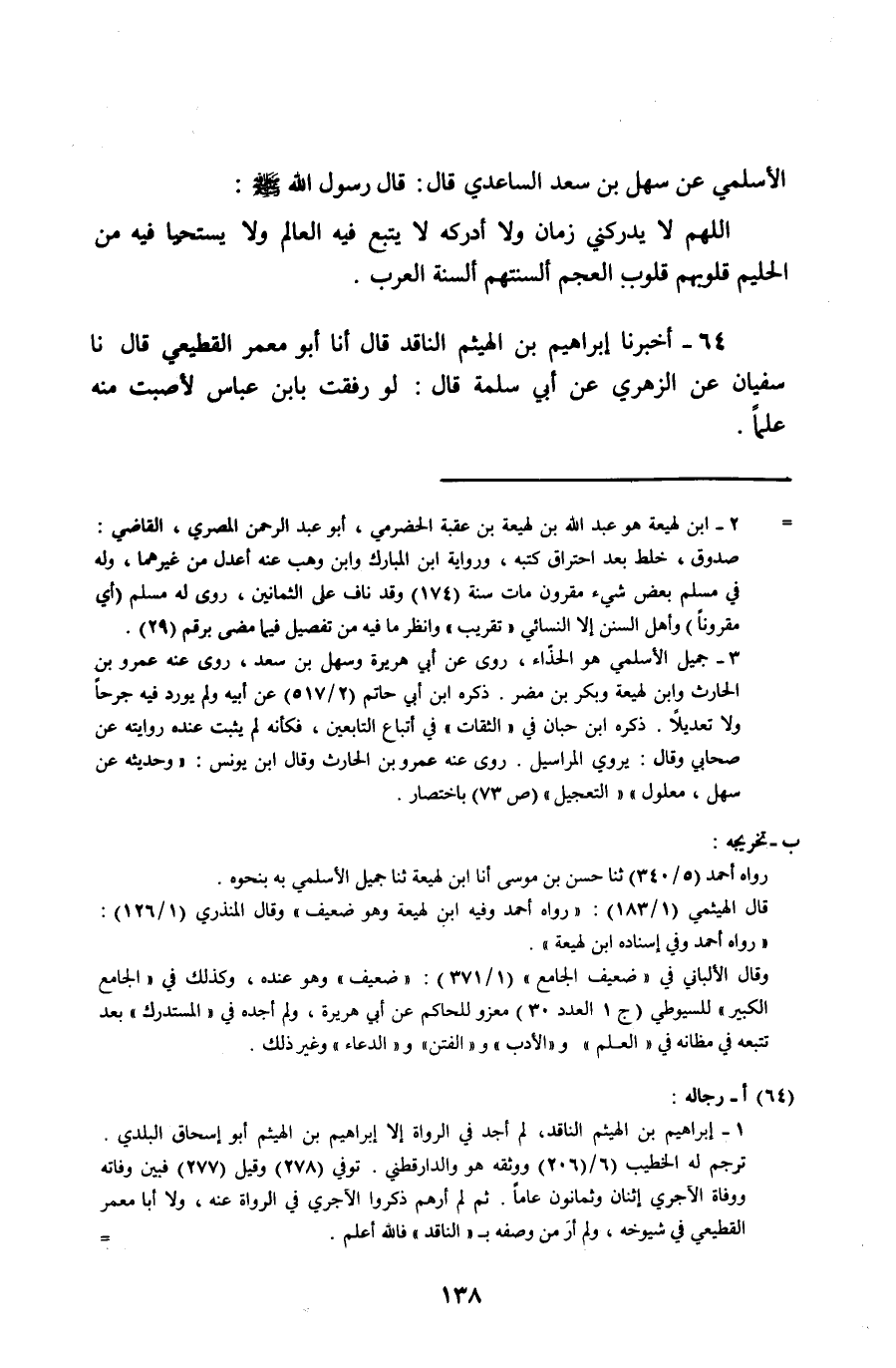 64 - أَخْبَرَنَا إِبْرَاهِيمُ بْنُ الْهَيْثَمِ النَّاقِدُ قَالَ: نا أَبُو مَعْمَرٍ الْقَطِيعِيُّ , قَالَ: نا سُفْيَانُ عَنِ الزُّهْرِيِّ , عَنْ أَبِي سَلْمَةَ , قَالَ: «§لَوْ رَفَقْتُ بِابْنِ عَبَّاسٍ لَأَصَبْتُ مِنْهُ عِلْمًا» (¬1) .