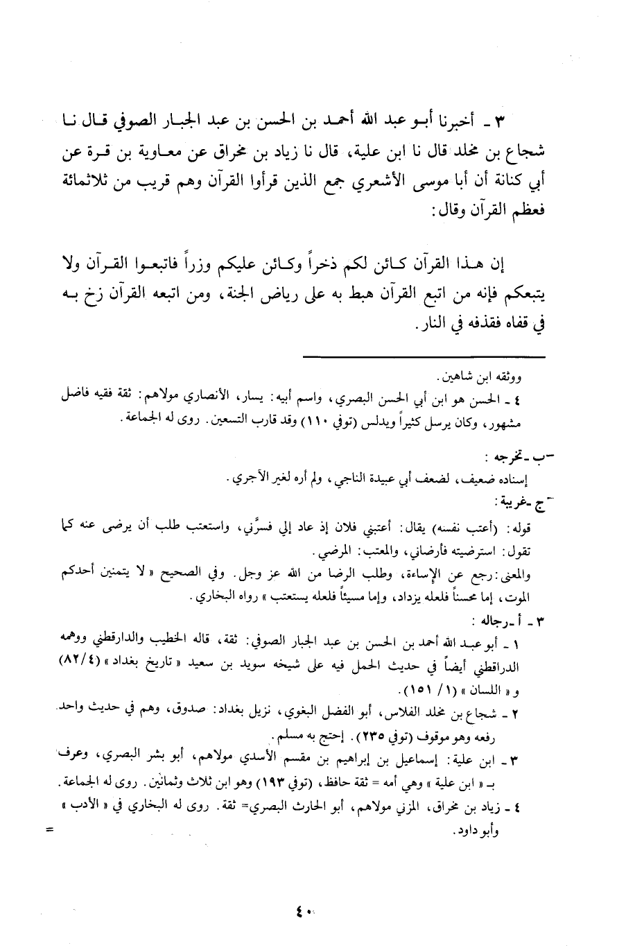 4 - أَخْبَرَنَا أَبُو عَبْدِ اللَّهِ أَحْمَدُ بْنُ الْحَسَنِ بْنِ عَبْدِ الْجَبَّارِ الصُّوفِيُّ قَالَ: نا شُجَاعُ بْنُ مَخْلَدٍ قَالَ: نا ابْنُ عُلَيَّةَ , قَالَ: نا زِيَادُ بْنُ مِخْرَاقٍ , عَنْ مُعَاوِيَةَ بْنِ قُرَّةَ , عَنْ أَبِي كِنَانَةَ أَنَّ أَبَا مُوسَى الْأَشْعَرِيَّ جَمَعَ الَّذِينَ قَرَءُوا الْقُرْآنَ وَهُمْ قَرِيبٌ مِنْ ثَلَاثِمِائَةٍ , فَعَظَّمَ الْقُرْآنَ وَقَالَ: إِنَّ §هَذَا الْقُرْآنَ كَائِنٌ لَكُمْ ذُخْرًا , وَكَائِنٌ عَلَيْكُمْ وِزْرًا , فَاتَّبِعُوا الْقُرْآنَ وَلَا يَتَّبِعْكُمْ , فَإِنَّهُ مَنِ اتَّبَعَ الْقُرْآنَ هَبَطَ بِهِ عَلَى رِيَاضِ الْجَنَّةِ , وَمَنِ اتَّبَعَهُ الْقُرْآنُ زُجَّ فِي قَفَاهُ , فَقَذَفَهُ فِي النَّارِ "