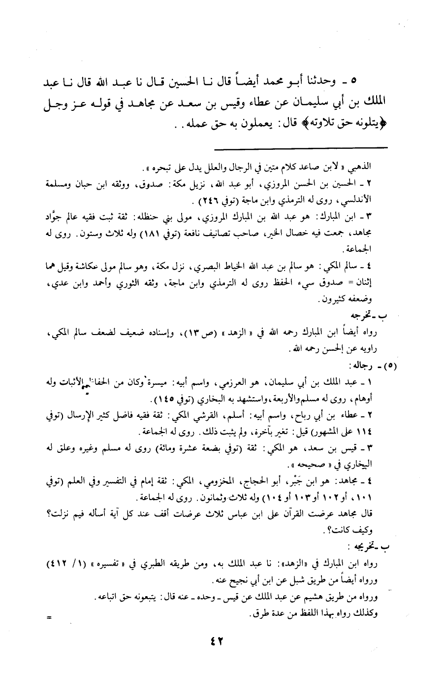 5 - وَحَدَّثَنَا أَبُو مُحَمَّدٍ , أَيْضًا قَالَ: نا الْحُسَيْنُ , قَالَ لَنَا عَبْدُ اللَّهِ: قَالَ لَنَا عَبْدُ الْمَلِكِ بْنُ أَبِي سُلَيْمَانَ , عَنْ عَطَاءٍ وَقَيْسِ بْنِ سَعْدٍ , عَنْ مُجَاهِدٍ فِي قَوْلِهِ عَزَّ وَجَلَّ: {§يَتْلُونَهُ حَقَّ تِلَاوَتِهِ} [البقرة: 121] قَالَ: يَعْمَلُونَ بِهِ حَقَّ عَمَلِهِ "