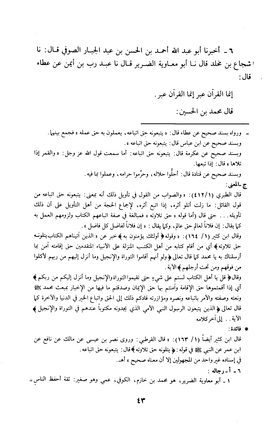6 - أَخْبَرَنَا أَبُو عَبْدِ اللَّهِ أَحْمَدُ بْنُ الْحَسَنِ بْنِ عَبْدِ الْجَبَّارِ الصُّوفِيُّ قَالَ: نا شُجَاعُ بْنُ مَخْلَدٍ قَالَ: نا أَبُو مُعَاوِيَةَ الضَّرِيرُ قَالَ: نا عَبْدُ رَبِّ بْنُ أَيْمَنَ , عَنْ عَطَاءٍ قَالَ: «إِنَّمَا §الْقُرْآنُ عِبَرٌ , إِنَّمَا الْقُرْآنُ عِبَرٌ» قَالَ مُحَمَّدُ بْنُ الْحُسَيْنِ: -[44]- وَقَبْلَ أَنْ أَذْكُرَ أَخْلَاقَ أَهْلِ الْقُرْآنِ , وَمَا يَنْبَغِي لَهُمْ أَنْ يَتَأَدَّبُوا بِهِ، أَذْكُرُ فَضْلَ حَمَلَةِ الْقُرْآنِ لِيَرْغَبُوا فِي تِلَاوَتِهِ، وَالْعَمَلِ بِهِ، وَالتَّوَاضُعِ لِمَنْ تَعَلَّمُوا مِنْهُ أَوْ عَلَّمُوهُ