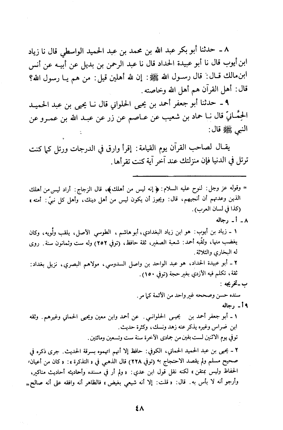 8 - حَدَّثَنَا أَبُو بَكْرٍ عَبْدُ اللَّهِ بْنُ مُحَمَّدِ بْنِ عَبْدِ الْحَمِيدِ الْوَاسِطِيُّ , قَالَ: نا زِيَادُ بْنُ أَيُّوبَ قَالَ: نا أَبُو عُبَيْدَةَ الْحَدَّادُ قَالَ: نا عَبْدُ الرَّحْمَنِ بْنُ بُدَيْلٍ , عَنْ أَبِيهِ , عَنْ أَنَسِ بْنِ مَالِكٍ قَالَ: قَالَ رَسُولُ اللَّهِ صَلَّى اللهُ عَلَيْهِ وَسَلَّمَ: «إِنَّ §لِلَّهِ أَهْلِينَ» قِيلَ: مَنْ هُمْ يَا رَسُولَ اللَّهِ؟ قَالَ: «أَهْلُ الْقُرْآنِ هُمْ أَهْلُ اللَّهِ وَخَاصَّتُهُ»