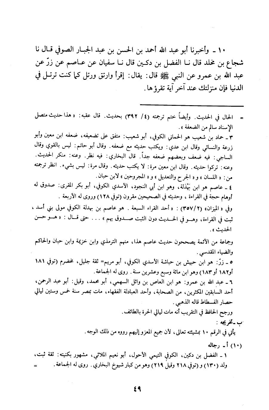 10 - وَأَخْبَرَنَا أَبُو عَبْدِ اللَّهِ أَحْمَدُ بْنُ الْحَسَنِ بْنِ عَبْدِ الْجَبَّارِ الصُّوفِيُّ قَالَ: نا شُجَاعُ بْنُ مَخْلَدٍ نا الْفَضْلُ بْنُ دُكَيْنٍ , قَالَ: نا سُفْيَانُ , عَنْ عَاصِمٍ عَنْ زِرٍّ , وَعَنْ عَبْدِ اللَّهِ بْنِ عَمْرٍو , وَعَنِ النَّبِيِّ صَلَّى اللهُ عَلَيْهِ وَسَلَّمَ قَالَ: «§يُقَالُ اقْرَأْ وَارْتَقِ وَرَتِّلْ كَمَا كُنْتَ تُرَتِّلُ فِي الدُّنْيَا , فَإِنَّ مَنْزِلَتَكَ عِنْدَ آخِرِ آيَةٍ تَقْرَؤُهَا» قَالَ مُحَمَّدُ بْنُ الْحُسَيْنِ: -[50]- وَرَوِيَ عَنْ أُمِّ الدَّرْدَاءِ أَنَّهَا قَالَتْ: سَأَلْتُ عَائِشَةَ عَمَّنْ دَخَلَ الْجَنَّةَ مِمَّنْ قَرَأَ الْقُرْآنَ: مَا فَضْلُهُ عَلَى مَنْ لَمْ يَقْرَأْهُ؟ فَقَالَتْ عَائِشَةُ: إِنَّ عَدَدَ دَرَجِ الْجَنَّةِ بِعَدَدِ آيِ الْقُرْآنِ , فَمَنْ دَخَلَ الْجَنَّةَ مِمَّنْ قَرَأَ الْقُرْآنَ فَلَيْسَ فَوْقَهُ أَحَدٌ