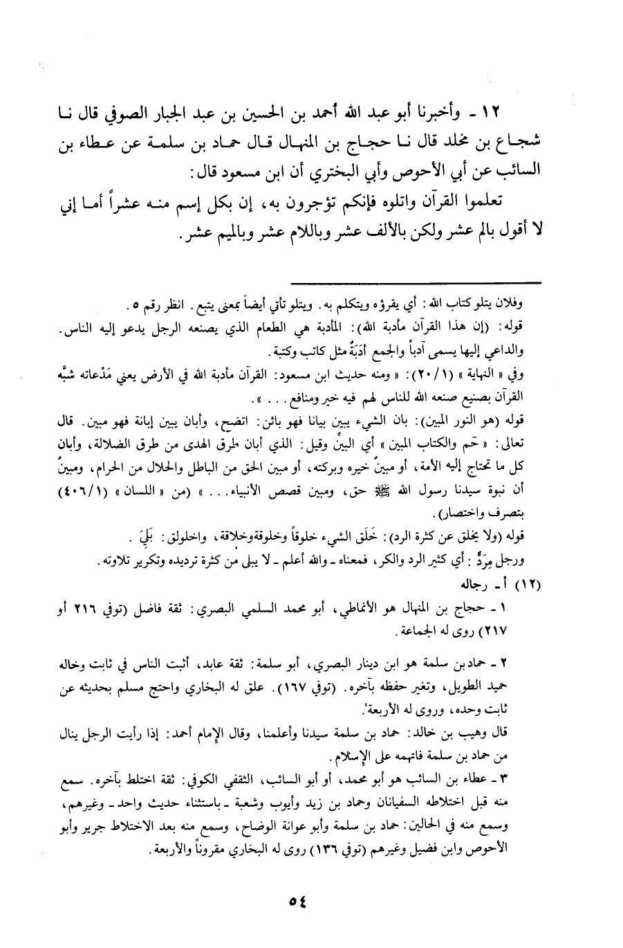 12 - وَأَخْبَرَنَا أَبُو عَبْدِ اللَّهِ أَحْمَدُ بْنُ الْحُسَيْنِ بْنِ عَبْدِ الْجَبَّارِ الصُّوفِيُّ قَالَ: نا شُجَاعُ بْنُ مَخْلَدٍ قَالَ: نا حَجَّاجُ بْنُ الْمِنْهَالِ قَالَ: نا حَمَّادُ بْنُ سَلَمَةَ عَنْ عَطَاءِ بْنِ السَّائِبِ , عَنْ أَبِي الْأَحْوَصِ , وَأَبِي الْبَخْتَرِيِّ أَنَّ ابْنَ مَسْعُودٍ , قَالَ: §تَعَلَّمُوا الْقُرْآنَ وَاتْلُوهُ فَإِنَّكُمْ تُؤْجَرُونَ بِهِ , إِنَّ بِكُلِّ اسْمٍ مِنْهُ عَشْرًا أَمَا إِنِّي لَا أَقُولُ بِ {ألم} [البقرة: 33] عَشْرٌ , وَلَكِنْ بِالْأَلِفِ عَشْرٌ وَبِاللَّامِ عَشْرٌ , وَبِالْمِيمِ عَشْرٌ "