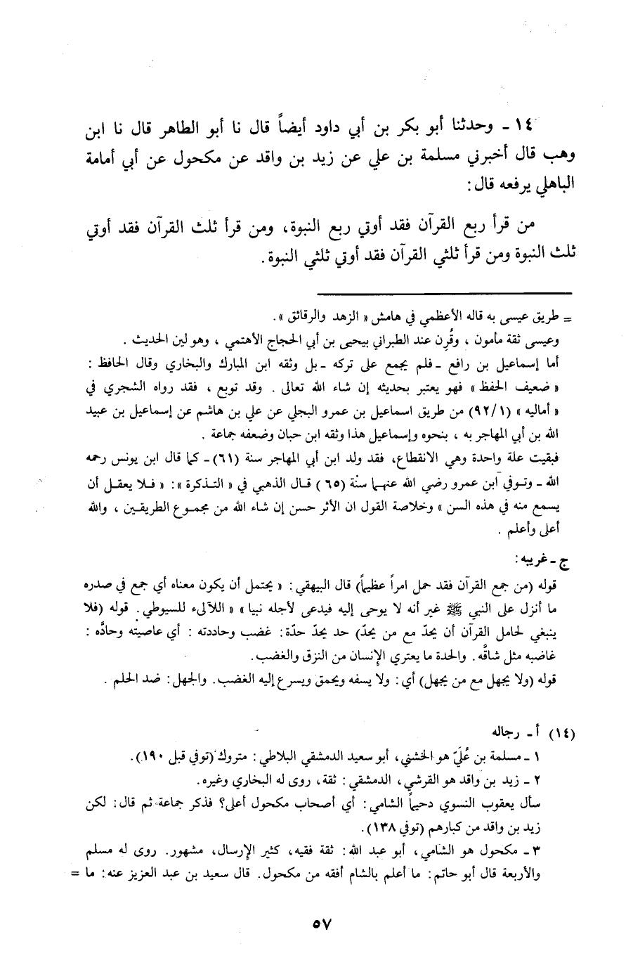 14 - وَحَدَّثَنَا أَبُو بَكْرِ بْنُ أَبِي دَاوُدَ أَيْضًا، قَالَ: نا أَبُو الطَّاهِرِ , قَالَ: نا ابْنُ وَهْبٍ , قَالَ: أَخْبَرَنِي سَلَمَةُ بْنُ عَلِيٍّ , عَنْ زَيْدِ بْنِ وَاقِدٍ , عَنْ مَكْحُولٍ , عَنْ أَبِي أُمَامَةَ الْبَاهِلِيِّ يَرْفَعُهُ قَالَ: «§مَنْ قَرَأَ رُبُعَ الْقُرْآنِ فَقَدْ أُوتِيَ رُبُعَ النُّبُوَّةِ , وَمَنْ قَرَأَ ثُلُثَ الْقُرْآنِ فَقَدْ أُوتِيَ ثُلُثَ النُّبُوَّةِ , وَمَنْ قَرَأَ ثُلُثَيِ الْقُرْآنِ فَقَدْ أُوتِيَ ثُلُثَيِ النُّبُوَّةِ , وَمَنْ قَرَأَ الْقُرْآنَ فَقَدْ أُوتِيَ النُّبُوَّةَ»
