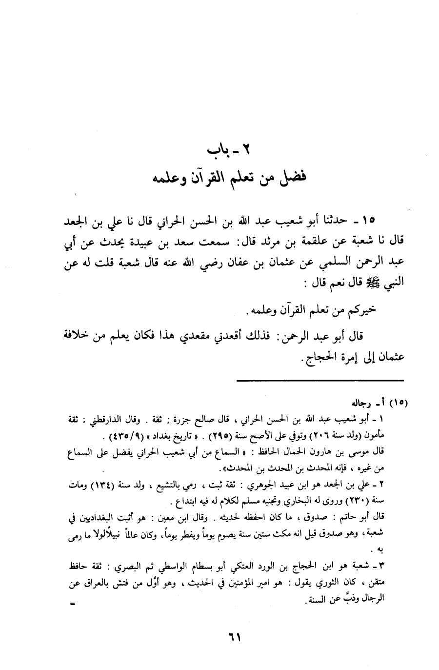 15 - حَدَّثَنَا أَبُو شُعَيْبٍ عَبْدُ اللَّهِ بْنُ الْحَسَنِ الْحَرَّانِيُّ , قَالَ: نا عَلِيُّ بْنُ الْجَعْدِ قَالَ: نا شُعْبَةُ , عَنْ عَلْقَمَةَ بْنِ مَرْثَدٍ قَالَ: سَمِعْتُ سَعْدَ بْنَ عُبَيْدَةَ يُحَدِّثُ عَنْ أَبِي عَبْدِ الرَّحْمَنِ السُّلَمِيِّ , عَنْ عُثْمَانَ بْنِ عَفَّانَ رَضِيَ اللَّهُ عَنْهُ قَالَ شُعْبَةُ: قُلْتُ لَهُ: عَنِ النَّبِيِّ صَلَّى اللهُ عَلَيْهِ وَسَلَّمَ؟ قَالَ: نَعَمْ قَالَ: «§خَيْرُكُمْ مَنْ تَعَلَّمَ الْقُرْآنَ وَعَلَّمَهُ» (¬1) .