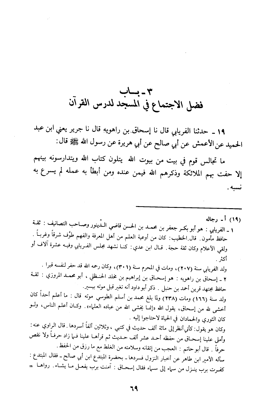 19 - حَدَّثَنَا الْفِرْيَابِيُّ , قَالَ: نا إِسْحَقُ بْنُ رَاهَوَيْهِ قَالَ لَنَا جَرِيرٌ يَعْنِي ابْنَ عَبْدِ الْحَمِيدِ , عَنِ الْأَعْمَشِ , عَنْ أَبِي صَالِحٍ , عَنْ أَبِي هُرَيْرَةَ , عَنْ رَسُولِ اللَّهِ صَلَّى اللهُ عَلَيْهِ وَسَلَّمَ قَالَ: «§مَا تَجَالَسَ قَوْمٌ فِي بَيْتٍ مِنْ بُيُوتِ اللَّهِ , يَتْلُونَ كِتَابَ اللَّهِ , وَيَتَدَارَسُونَهُ بَيْنَهُمْ , إِلَّا حَفَّتْ بِهِمُ الْمَلَائِكَةُ , وَغَشِيَتْهُمُ الرَّحْمَةُ , وَذَكَرَهُمُ اللَّهُ فِيمَنْ عِنْدَهُ , وَمَنْ أَبْطَأَ بِهِ عَمَلُهُ , لَمْ يُسْرِعْ بِهِ نَسَبُهُ» قَالَ: -[72]-
