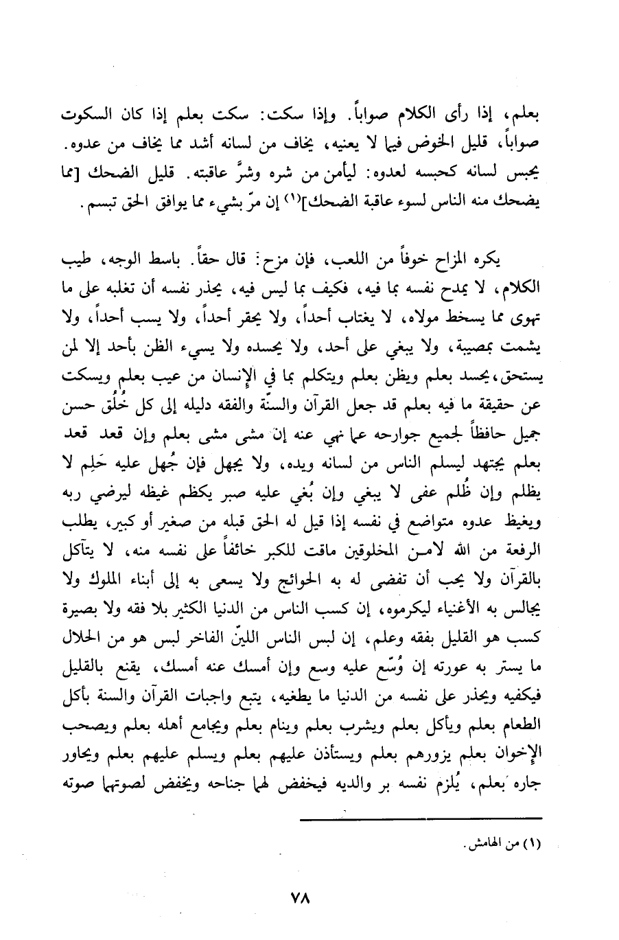 بِعِلْمٍ إِذَا رَأَى الْكَلَامَ صَوَابًا , وَإِنْ سَكَتَ سَكَتَ بِعِلْمٍ إِذَا كَانَ السُّكُوتُ صَوَابًا , قَلِيلُ الْخَوْضِ فِيمَا لَا يَعْنِيهِ , يَخَافُ مِنْ لِسَانِهِ أَشَدَّ مِمَّا يَخَافُ عَدُوَّهُ , يَحْبِسُ لِسَانَهُ كَحَبْسِهِ لِعَدُوِّهِ؛ لِيَأْمَنَ شَرَّهُ وَشَرَّ عَاقِبَتِهِ , قَلِيلُ الضَّحِكِ مِمَّا يَضْحَكُ مِنْهُ النَّاسُ لِسُوءِ عَاقِبَةِ الضَّحِكِ , إِنْ سُرَّ بِشَيْءٍ مِمَّا يُوَافِقُ الْحَقَّ تَبَسَّمَ , يَكْرَهُ الْمِزَاحَ خَوْفًا مِنَ اللَّعِبِ , فَإِنْ مَزَحَ قَالَ حَقًّا , بَاسِطُ الْوَجْهِ , طَيِّبُ الْكَلَامِ , لَا يَمْدَحُ نَفْسَهُ بِمَا فِيهِ , فَكَيْفَ بِمَا لَيْسَ فِيهِ؟ يُحَذِّرُ نَفْسَهُ أَنْ تُغْلَبَ عَلَى مَا تَهْوَى مِمَّا يُسْخِطُ مَوْلَاهُ , لَا يَغْتَابُ أَحَدًا , وَلَا يَحْقِرُ أَحَدًا , وَلَا يَسُبُّ أَحَدًا , وَلَا يَشْمَتُ بِمُصِيبِهِ , وَلَا يَبْغِي عَلَى أَحَدٍ , وَلَا يَحْسُدُهُ , وَلَا يُسِيءُ الظَّنَّ بِأَحَدٍ إِلَّا لِمَنْ يَسْتَحِقُّ يَحْسُدُ بِعِلْمٍ , وَيَظُنُّ بِعِلْمٍ , وَيَتَكَلَّمُ بِمَا فِي الْإِنْسَانِ مِنْ عَيْبٍ بِعِلْمٍ , وَيَسْكُتُ عَنْ حَقِيقَةِ مَا فِيهِ بِعِلْمٍ , وَقَدْ جَعَلَ الْقُرْآنَ وَالسُّنَّةَ وَالْفِقْهَ دَلَيْلَهُ إِلَى كُلِّ خُلُقٍ حَسَنٍ جَمِيلٍ , حَافِظًا لِجَمِيعِ جَوَارِحِهِ عَمَّا نُهِيَ عَنْهُ , إِنْ مَشَى بِعِلْمٍ , وَإِنْ قَعَدَ قَعَدَ بِعِلْمٍ , يَجْتَهِدُ لِيَسْلَمَ النَّاسُ مِنْ لِسَانِهِ وَيَدِهِ , لَا يَجْهَلُ؛ فَإِنْ جُهِلَ عَلَيْهِ حَلُمَ , لَا يَظْلِمُ , وَإِنْ ظُلِمَ عَفَا , لَا يَبْغِي , وَإِنْ بُغِيَ عَلَيْهِ صَبَرَ , يَكْظِمُ غَيْظَهُ لِيُرْضِيَ رَبَّهُ وَيَغِيظَ عَدُوَّهُ , مُتَوَاضِعٌ فِي نَفْسِهِ , إِذَا قِيلَ لَهُ الْحَقُّ قَبِلَهُ مِنْ صَغِيرٍ أَوْ كَبِيرٍ , يَطْلُبُ الرِّفْعَةَ مِنَ اللَّهِ , لَا مِنَ الْمَخْلُوقِينَ , مَاقِتًا لِلْكِبْرِ , خَائِفًا عَلَى نَفْسِهِ مِنْهُ , لَا يَتَآكَلُ بِالْقُرْآنِ وَلَا يُحِبُّ أَنْ يَقْضِيَ بِهِ الْحَوَائِجَ , وَلَا يَسْعَى بِهِ إِلَى أَبْنَاءِ الْمُلُوكِ , وَلَا يُجَالِسُ بِهِ الْأَغْنِيَاءَ لِيُكْرِمُوهُ , إِنْ كَسَبَ النَّاسُ مِنَ الدُّنْيَا الْكَثِيرَ بِلَا فِقْهٍ وَلَا بَصِيرَةٍ , كَسَبَ هُوَ الْقَلِيلَ بِفِقْهٍ وَعِلْمٍ , إِنْ لَبِسَ النَّاسُ اللَّيِّنَ الْفَاخِرَ , لَبِسَ هُوَ مِنَ الْحَلَالِ مَا يَسْتُرُ بِهِ عَوْرَتَهُ , إِنْ وُسِّعَ عَلَيْهِ وَسَّعَ , وَإِنْ أُمْسِكَ عَلَيْهِ أَمْسَكَ , يَقْنَعُ بِالْقَلِيلِ فَيَكْفِيهِ , وَيَحْذَرُ عَلَى نَفْسِهِ مِنَ الدُّنْيَا مَا يُطْغِيهِ يَتْبَعُ وَاجِبَاتِ الْقُرْآنِ وَالسُّنَّةِ , يَأْكُلُ الطَّعَامَ بِعِلْمٍ , وَيَشْرَبُ بِعِلْمٍ , وَيَلْبَسُ بِعِلْمٍ , وَيَنَامُ بِعِلْمٍ , وَيُجَامِعُ أَهْلَهُ بِعِلْمٍ , وَيَصْطَحِبُ الْإِخْوَانَ بِعِلْمٍ , وَيَزُورُهُمْ بِعِلْمٍ , وَيَسْتَأْذِنُ عَلَيْهِمْ بِعِلْمٍ , وَيُسَلِّمُ عَلَيْهِمْ بِعِلْمٍ , وَيُجَاوِرُ جَارَهُ بِعِلْمٍ , يُلْزِمُ نَفْسَهُ بِرَّ وَالِدَيْهِ: فَيَخْفِضُ لَهُمَا جَنَاحَهُ , وَيَخْفِضُ لِصَوْتِهِمَا صَوْتَهُ ,