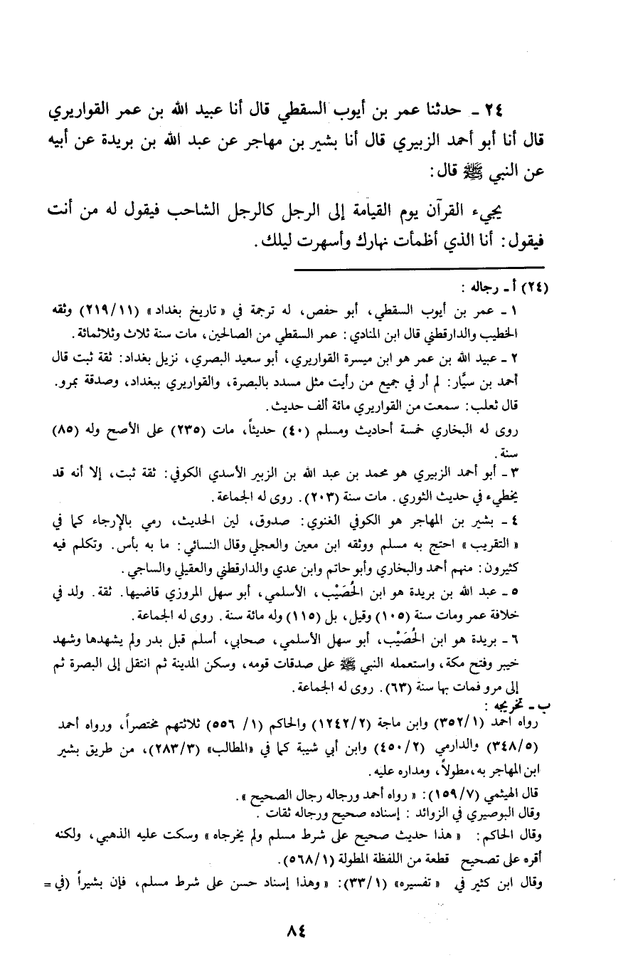24 - حَدَّثَنَا عُمَرُ بْنُ أَيُّوبَ السَّقَطِيُّ قَالَ: نا عُبَيْدُ اللَّهِ بْنُ عُمَرَ الْقَوَارِيرِيُّ قَالَ: نا أَبُو أَحْمَدَ الزُّبَيْرِيُّ , قَالَ: نا بَشِيرُ بْنُ مُهَاجِرٍ , عَنْ عَبْدِ اللَّهِ بْنِ بُرَيْدَةَ , عَنْ أَبِيهِ , عَنِ النَّبِيِّ صَلَّى اللهُ عَلَيْهِ وَسَلَّمَ قَالَ: «§يَجِيءُ الْقُرْآنُ يَوْمَ الْقِيَامَةِ إِلَى الرَّجُلِ كَالرَّجُلِ الشَّاحِبِ فَيَقُولُ لَهُ: مَنْ أَنْتَ؟ فَيَقُولُ: أَنَا الَّذِي أَظْمَأْتُ نَهَارَكَ وَأَسْهَرْتُ لَيْلَكَ» (¬1) .