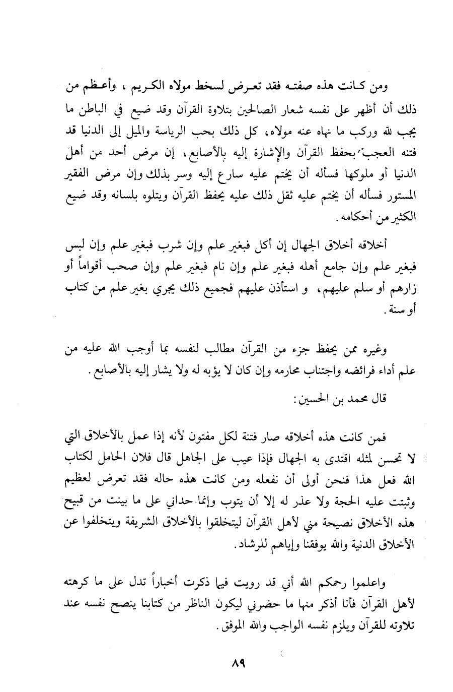 وَمَنْ كَانَتْ هَذِهِ صِفَتَهُ فَقَدْ تَعَرَّضَ لِسَخَطِ مَوْلَاهُ الْكَرِيمِ , وَأَعْظَمُ مِنْ ذَلِكَ , إِنْ أَظْهَرَ عَلَى نَفْسِهِ شِعَارَ الصَّالِحِينَ بِتِلَاوَةِ الْقُرْآنِ , وَقَدْ ضَيَّعَ فِي الْبَاطِنِ مَا يَجِبُ لِلَّهِ , وَرَكِبَ مَا نَهَاهُ عَنْهُ مَوْلَاهُ , كُلُّ ذَلِكَ بِحُبِّ الرِّيَاسَةِ وَالْمَيْلِ إِلَى الدُّنْيَا قَدْ فَتَنَهُ الْعُجْبُ بِحِفْظِ الْقُرْآنِ , وَالْإِشَارَةِ إِلَيْهِ بِالْأَصَابِعِ , إِنْ مَرِضَ أَحَدٌ مِنْ أَبْنَاءِ الدُّنْيَا أَوْ مُلُوكِهَا , فَسَأَلَهُ أَنْ يَخْتِمَ عَلَيْهِ سَارَعَ إِلَيْهِ وَسُرَّ بِذَلِكَ , وَإِنْ مَرِضَ الْفَقِيرُ الْمَسْتُورُ , فَسَأَلَهُ أَنْ يَخْتِمَ عَلَيْهِ ثَقُلَ ذَلِكَ عَلَيْهِ يَحْفَظُ الْقُرْآنَ وَيَتْلُوهُ بِلِسَانِهِ , وَقَدْ ضَيَّعَ الْكَثِيرَ مِنْ أَحْكَامِهِ , أَخْلَاقُهُ أَخْلَاقُ الْجُهَّالِ , إِنْ أَكَلَ فَبِغَيْرِ عِلْمٍ , وَإِنْ شَرِبَ فَبِغَيْرِ عِلْمٍ , وَإِنْ لَبِسَ فَبِغَيْرِ عِلْمٍ , وَإِنْ جَامَعَ أَهْلَهُ فَبِغَيْرِ عِلْمٍ , وَإِنْ نَامَ فَبِغَيْرِ عِلْمٍ , وَإِنْ صَحِبَ أَقْوَامًا أَوْ زَارَهُمْ , أَوْ سَلَّمَ عَلَيْهِمْ , أَوِ اسْتَأْذَنَ عَلَيْهِمْ , فَجَمِيعُ ذَلِكَ يَجْرِي بِغَيْرِ عِلْمٍ مِنْ كِتَابٍ أَوْ سُنَّةٍ , وَغَيْرُهُ مِمَّنْ يَحْفَظُ جُزْءًا مِنَ الْقُرْآنِ مُطَالِبٌ لِنَفْسِهِ بِمَا أَوْجَبَ اللَّهُ عَلَيْهِ مِنْ عِلْمِ أَدَاءِ فَرَائِضِهِ وَاجْتِنَابِ مَحَارِمِهِ , وَإِنْ كَانَ لَا يُؤْبَهُ لَهُ وَلَا يُشَارُ إِلَيْهِ بِالْأَصَابِعِ قَالَ مُحَمَّدُ بْنُ الْحُسَيْنِ: فَمَنْ كَانَتْ هَذِهِ أَخْلَاقَهُ صَارَ فِتْنَةً لِكُلِّ مَفْتُونٍ؛ لِأَنَّهُ إِذَا عَمِلَ بِالْأَخْلَاقِ الَّتِي لَا تَحْسُنُ بِمِثْلِهِ , اقْتَدَى بِهِ الْجُهَّالُ , فَإِذَا عِيبَ الْجَاهِلُ , قَالَ: فُلَانٌ الْحَامِلُ لِكِتَابِ اللَّهِ فَعَلَ هَذَا , فَنَحْنُ أَوْلَى أَنْ نَفْعَلَهُ وَمَنْ كَانَتْ هَذِهِ حَالَهُ , فَقَدْ تَعَرَّضَ لَعَظِيمٍ , وَثَبَتَتْ عَلَيْهِ الْحُجَّةُ , وَلَا عُذْرَ لَهُ إِلَّا أَنْ يَتُوبَ , وَإِنَّمَا حَدَانِي عَلَى مَا بَيَّنْتُ مِنْ قَبِيحِ هَذِهِ الْأَخْلَاقِ؛ نَصِيحَةً مِنِّي لِأَهْلِ الْقُرْآنِ لِيَتَخَلَّقُوا بِالْأَخْلَاقِ الشَّرِيفَةِ , وَيَتَجَانَبُوا الْأَخْلَاقَ الدَّنِيئَةَ , وَاللَّهُ يُوَفِّقُنَا وَإِيَّاهُمْ للِرَّشَادِ وَاعْلَمُوا رَحِمَكُمُ اللَّهُ أَنِّي قَدْ رَوَيْتُ فِيمَا ذَكَرْتُ أَخْبَارًا تَدُلُّ عَلَى مَا كَرِهْتُهُ لِأَهْلِ الْقُرْآنِ , فَأَنَا أَذْكُرُ مِنْهَا مَا حَضَرَنِي؛ لِيَكُونَ النَّاظِرُ فِي كِتَابِنَا يَنْصَحُ نَفْسَهُ عِنْدَ تِلَاوَتِهِ لِلْقُرْآنِ , وَيُلْزِمُ نَفْسَهُ الْوَاجِبَ , وَاللَّهُ الْمُوَفِّقُ