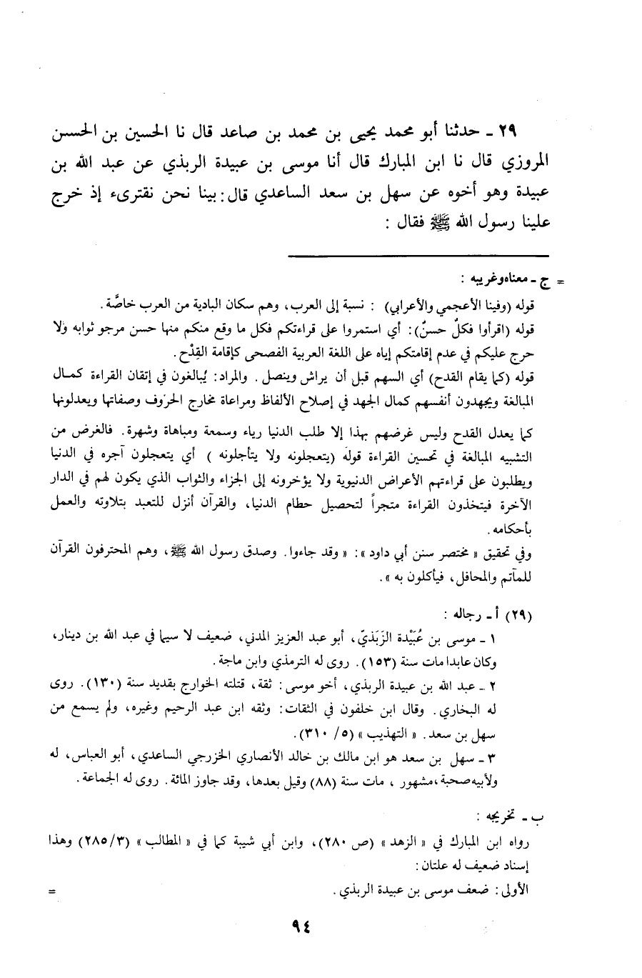 29 - حَدَّثَنَا أَبُو مُحَمَّدٍ يَحْيَى بْنُ مُحَمَّدِ بْنِ صَاعِدٍ قَالَ: نا الْحُسَيْنُ بْنُ الْحَسَنِ الْمَرْوَزِيُّ , قَالَ: نا ابْنُ الْمُبَارَكِ , قَالَ: أنا مُوسَى بْنُ عُبَيْدَةَ الرَّبْذِيُّ , عَنْ عَبْدِ اللَّهِ بْنِ عُبَيْدَةَ , وَهُوَ أَخُوهُ , عَنْ سَهْلِ بْنِ سَعْدٍ السَّاعِدِيِّ قَالَ: بَيْنَمَا نَحْنُ نَقْتَرِئُ إِذْ خَرَجَ عَلَيْنَا رَسُولُ اللَّهِ صَلَّى اللهُ عَلَيْهِ وَسَلَّمَ فَقَالَ: «§-[95]- الْحَمْدُ لِلَّهِ , كِتَابُ اللَّهِ وَاحِدٌ وَفِيكُمُ الْأَخْيَارُ , وَفِيكُمُ الْأَحْمَرُ وَالْأَسْوَدُ , اقْرَءُوا الْقُرْآنَ قَبْلَ أَنْ يَأْتِيَ أَقْوَامٌ يَقْرَءُونَهُ يُقِيمُونَ حُرُوفَهُ كَمَا يُقَامُ السَّهْمُ لَا يُجَاوِزُ تَرَاقِيَهُمْ , يَتَعَجَّلُونَ أَجْرَهُ وَلَا يَتَأَجَّلُونَهُ»