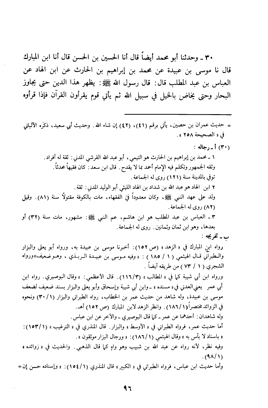 30 - وَحَدَّثَنَا أَبُو مُحَمَّدٍ , أَيْضًا قَالَ: نا الْحُسَيْنُ , قَالَ: أنا ابْنُ الْمُبَارَكِ , قَالَ: أنا مُوسَى بْنُ عُبَيْدَةَ , عَنْ مُحَمَّدِ بْنِ إِبْرَاهِيمَ بْنِ الْحَارِثِ , عَنِ ابْنَةِ الْهَادِ , عَنِ الْعَبَّاسِ بْنِ عَبْدِ الْمُطَّلِبِ , قَالَ: قَالَ رَسُولُ اللَّهِ صَلَّى اللهُ عَلَيْهِ وَسَلَّمَ: " §يَظْهَرُ هَذَا الدِّينُ حَتَّى يُجَاوِزَ الْبِحَارَ , وَحَتَّى يُخَاضَ بِالْخَيْلِ فِي سَبِيلِ اللَّهِ , ثُمَّ يَأْتِي قَوْمٌ يَقْرَءُونَ الْقُرْآنَ , فَإِذَا قَرَءُوهُ -[97]- قَالُوا: قَدْ قَرَأْنَا الْقُرْآنَ فَمَنْ أَقْرَأُ مِنَّا؟ فَمَنْ أَعْلَمُ مِنَّا؟ " ثُمَّ الْتَفَتَ إِلَى أَصْحَابِهِ فَقَالَ: «هَلْ تَرَوْنَ فِي أُولَئِكَ مِنْ خَيْرٍ؟» قَالُوا: لَا , قَالَ: «فَأُولَئِكَ مِنْكُمْ , وَأُولَئِكَ مِنْ هَذِهِ الْأُمَّةِ , وَأُولَئِكَ هُمْ وَقُودُ النَّارِ»