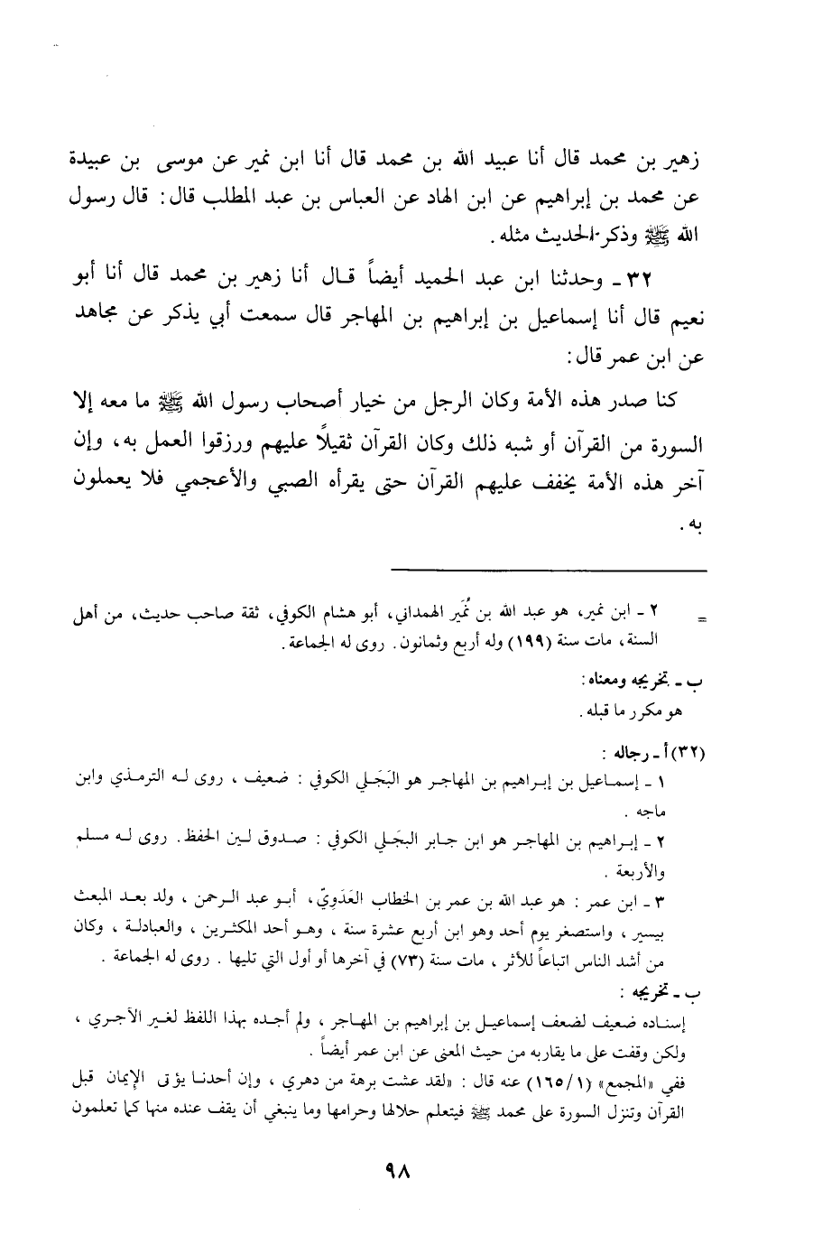 32 - وَحَدَّثَنَا ابْنُ عَبْدِ الْحَمِيدِ , أَيْضًا قَالَ: نا زُهَيْرُ بْنُ مُحَمَّدٍ , قَالَ لَنَا أَبُو نُعَيْمٍ , قَالَ: نا إِسْمَاعِيلُ بْنُ إِبْرَاهِيمَ بْنِ الْمُهَاجِرِ قَالَ: سَمِعْتُ أَبِي يَذْكُرُ عَنْ مُجَاهِدٍ , عَنِ ابْنِ عُمَرَ , قَالَ: «§كُنَّا صَدْرَ هَذِهِ الْأُمَّةِ وَكَانَ الرَّجُلُ مِنْ خِيَارِ أَصْحَابِ رَسُولِ اللَّهِ صَلَّى اللهُ عَلَيْهِ وَسَلَّمَ مَا مَعَهُ إِلَّا السُّورَةُ مِنَ الْقُرْآنِ أَوْ شِبْهُ ذَلِكَ , وَكَانَ الْقُرْآنُ ثَقِيلًا عَلَيْهِمْ وَرُزِقُوا الْعَمَلَ بِهِ , وَإِنَّ آخِرَ هَذِهِ الْأُمَّةِ يُخَفَّفُ عَلَيْهِمُ الْقُرْآنُ حَتَّى يَقْرَأَهُ الصَّبِيُّ وَالْأَعْجَمِيُّ فَلَا يَعْمَلُونَ بِهِ» . (¬1)