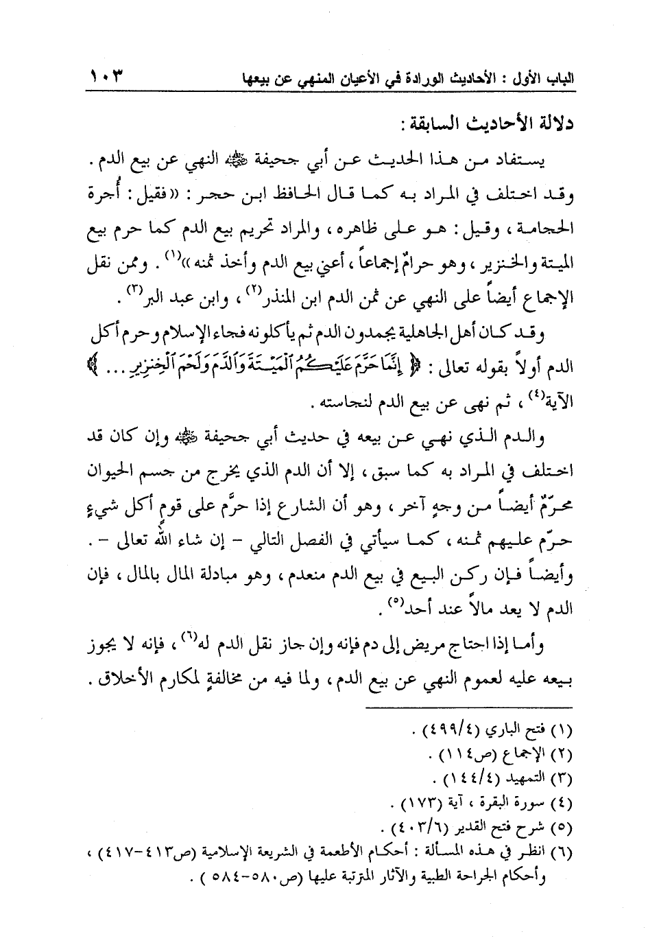 والدم الذي نهي عن بيعه في حديث أبي جحيفة رضي الله عنه وإن كان قد اختلف في المراد به كما سبق، إلا أن الدم الذي يخرج من جسم الحيوان محرّمٌ أيضاً من وجهٍ آخر، وهو أن الشارع إذا حرَّم على قومٍ أكل شيءٍ حرّم عليهم ثمنه، كما سيأتي في الفصل التالي - إن شاء الله تعالى -. وأيضاً فإن ركن البيع في بيع الدم منعدم، وهو مبادلة المال بالمال، فإن الدم لا يعد مالاً عند أحد5.