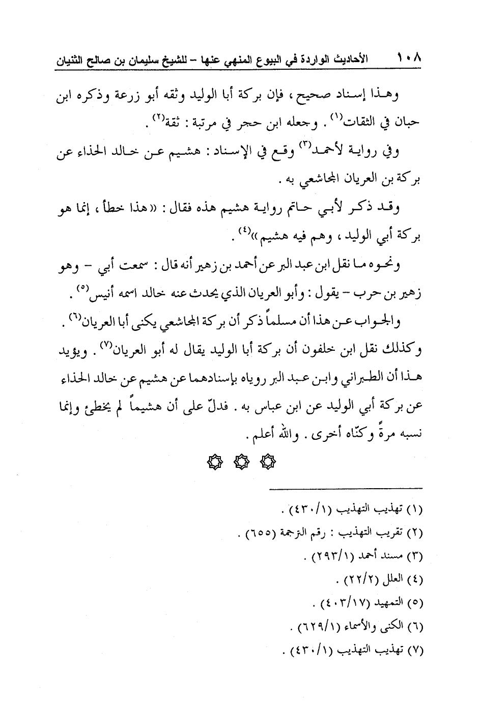 والجواب عن هذا أن مسلماً ذكر أن بركة المجاشعي يكنى أبا العريان6. وكذلك نقل ابن خلفون أن بركة أبا الوليد يقال له أبو العريان7. ويؤيد هذا أن الطبراني وابن عبد البر روياه بإسنادهما عن هشيم عن خالد الحذاء عن بركة أبي الوليد عن ابن عباس به. فدلّ على أن هشيماً لم يخطئ وإنما نسبه مرةً وكنّاه أخرى. والله أعلم.