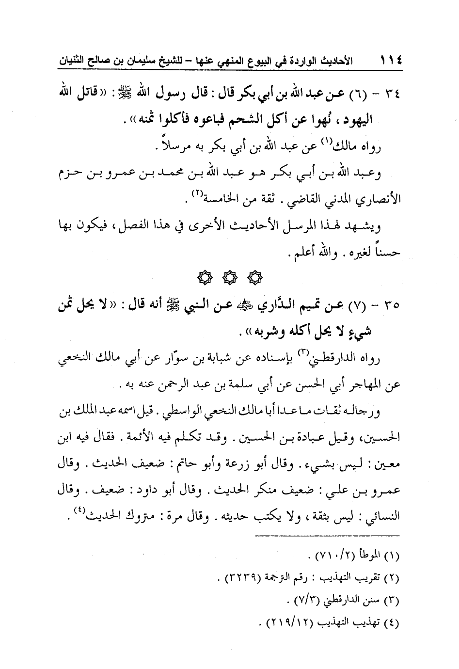 34 - (6) عن عبد الله بن أبي بكر قال: قال رسول الله صلى الله عليه وسلم: " قاتل الله اليهود، نُهوا عن أكل الشحم فباعوه فأكلوا ثمنه".