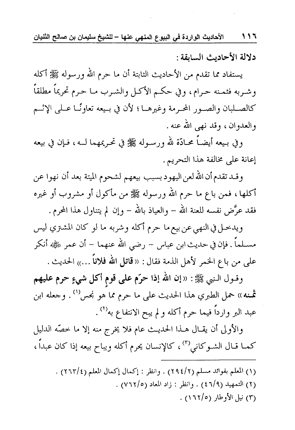 وقول النبي صلى الله عليه وسلم: "إن الله إذا حرّم على قومٍ أكل شيءٍ حرم عليهم ثمنه" حمل الطبري هذا الحديث على ما حرم مما هو نجس1. وجعله ابن عبد البر وارداً فيما حرم أكله ولم يبح الانتفاع به2.