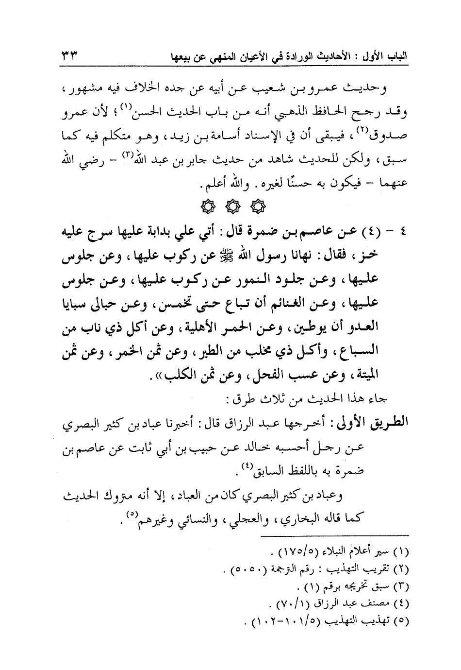 4 - (4) عن عاصم بن ضمرة قال: أتي علي بدابة عليها سرج عليه خز، فقال: "نهانا رسول الله صلى الله عليه وسلم عن ركوب عليها، وعن جلوس عليها، وعن جلود النمور عن ركوب عليها، وعن جلوس عليها، وعن الغنائم أن تباع حتى تخمس، وعن حبالى سبايا العدو أن يوطين، وعن الحمر الأهلية، وعن أكل ذي ناب من السباع، وأكل ذي مخلب من الطير، وعن ثمن الخمر، وعن ثمن الميتة، وعن عسب الفحل، وعن ثمن الكلب".