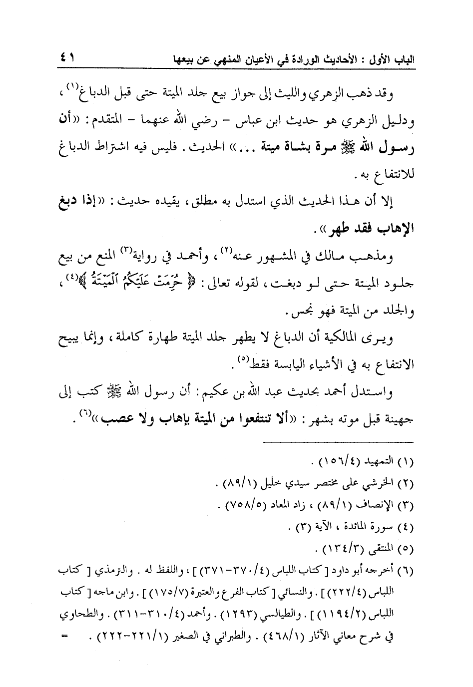 ومذهب مالك في المشهور عنه2، وأحمد في رواية3 المنع من بيع جلود الميتة حتى لو دبغت، لقوله تعالى: {حُرِّمَتْ عَلَيْكُمُ الْمَيْتَةُ} 4، والجلد من الميتة فهو نجس.