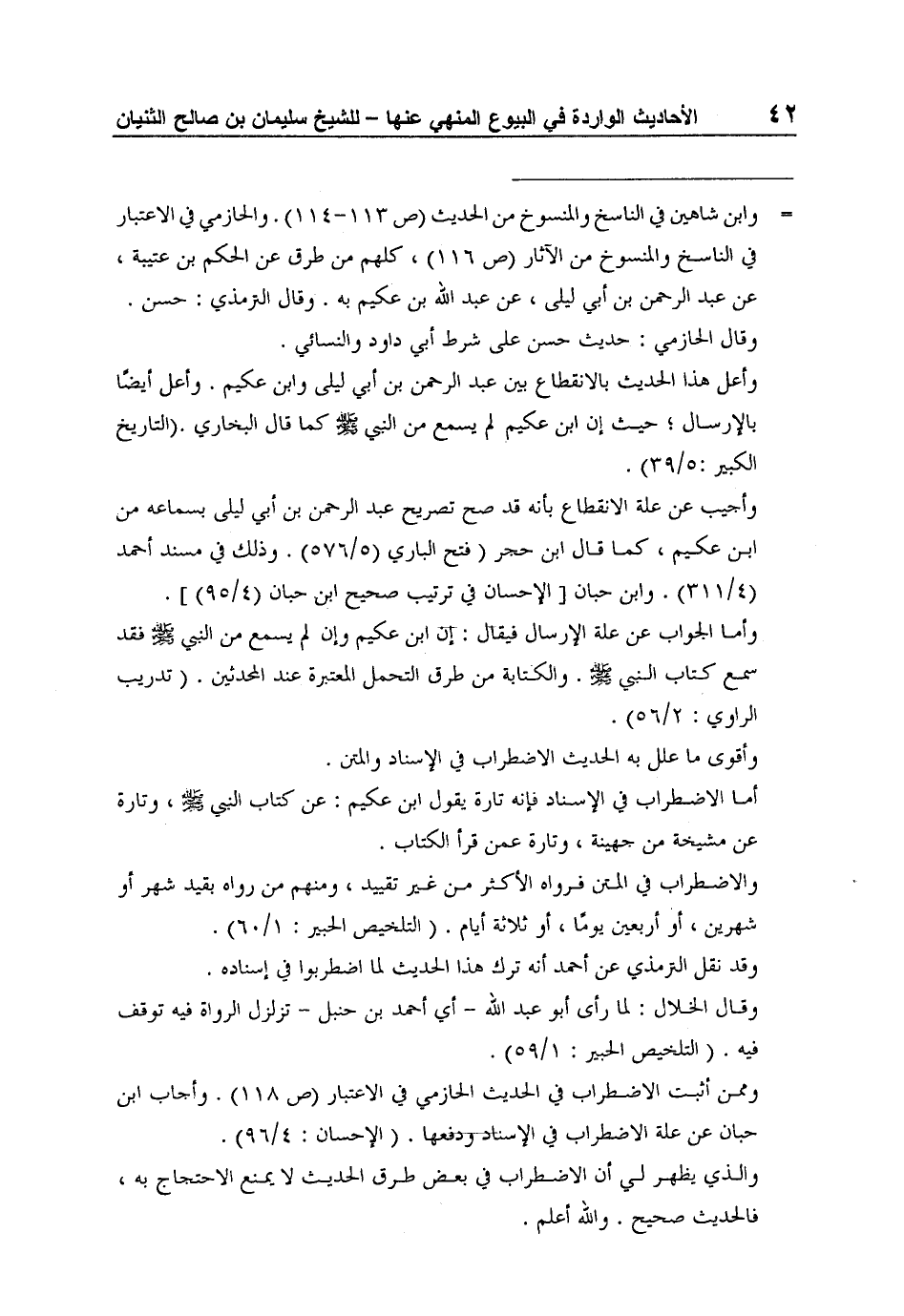 وممن أثبت الاضطراب في الحديث الحازمي في الاعتبار (ص 118) . وأجاب ابن حبان عن علة الاضطراب في الإسناد ودفعها. (الإحسان: 4/96) .