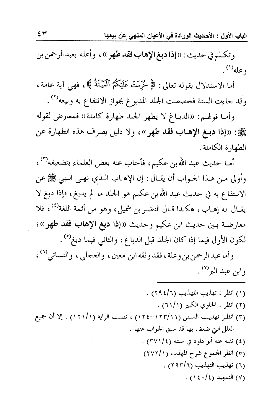 أما حديث عبد الله بن عكيم، فأجاب عنه بعض العلماء بتضعيفه3، وأولى من هذا الجواب أن يقال: إن الإهاب الذي نهى النبي صلى الله عليه وسلم عن الانتفاع به في حديث عبد الله بن عكيم هو الجلد ما لم يدبغ، فإذا دبغ لا يقال له إهاب، هكذا قال النضر بن شميل، وهو من أئمة اللغة4، فلا معارضة بين حديث ابن عكيم وحديث " إذا دبغ الإهاب فقد طهر"؛ لكون الأول فيما إذا كان الجلد قبل الدباغ، والثاني فيما دبغ5.