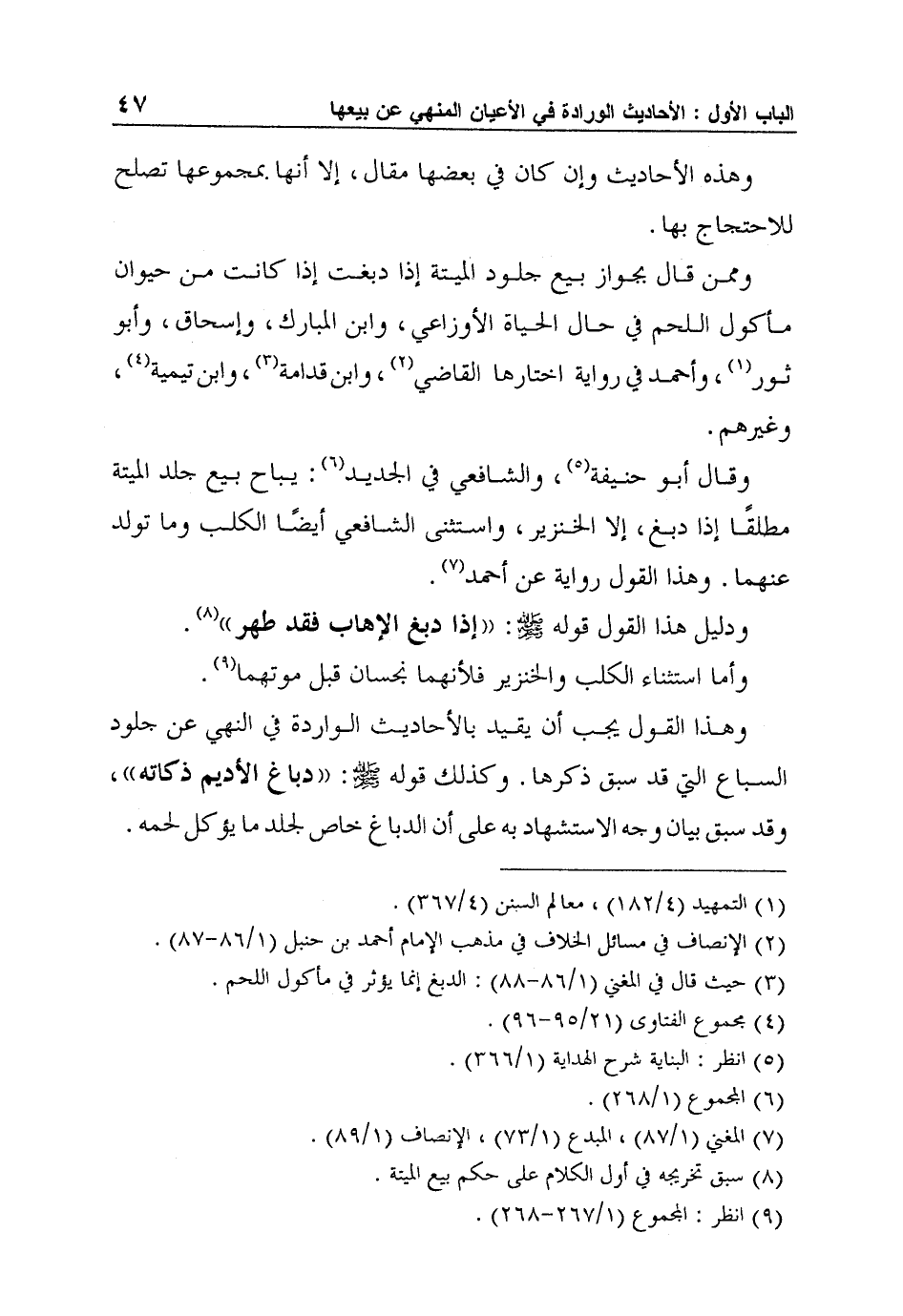 وقال أبو حنيفة5، والشافعي في الجديد6: يباح بيع جلد الميتة مطلقًا إذا دبغ، إلا الخنزير، واستثنى الشافعي أيضًا الكلب وما تولد عنهما. وهذا القول رواية عن أحمد7.