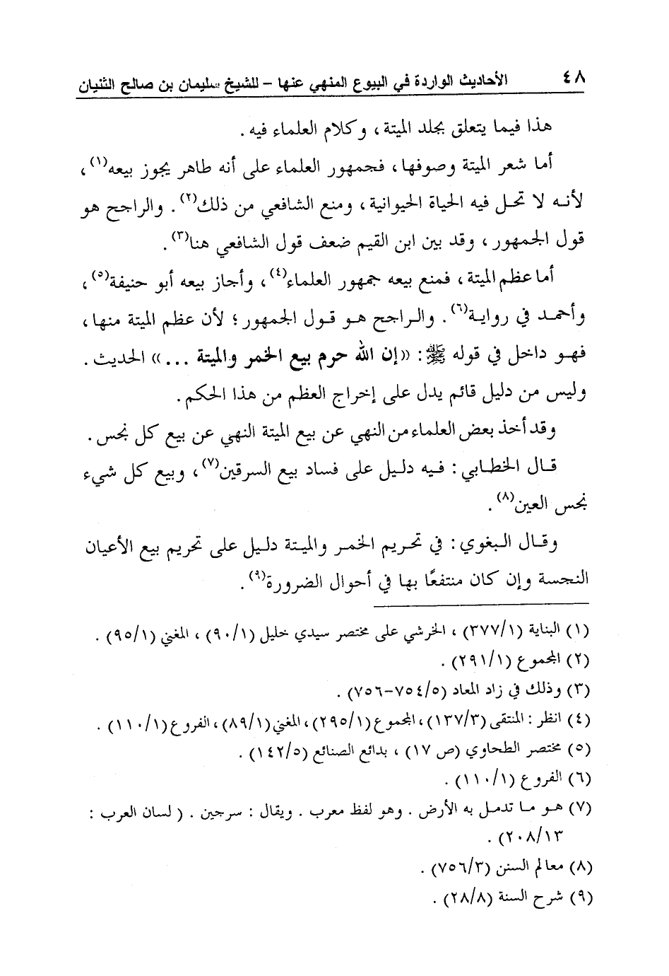 أما عظم الميتة، فمنع بيعه جمهور العلماء4، وأجاز بيعه أبو حنيفة5، وأحمد في رواية6. والراجح هو قول الجمهور؛ لأن عظم الميتة منها، فهو داخل في قوله صلى الله عليه وسلم: " إن الله حرم بيع الخمر والميتة …" الحديث. وليس من دليل قائم يدل على إخراج العظم من هذا الحكم.