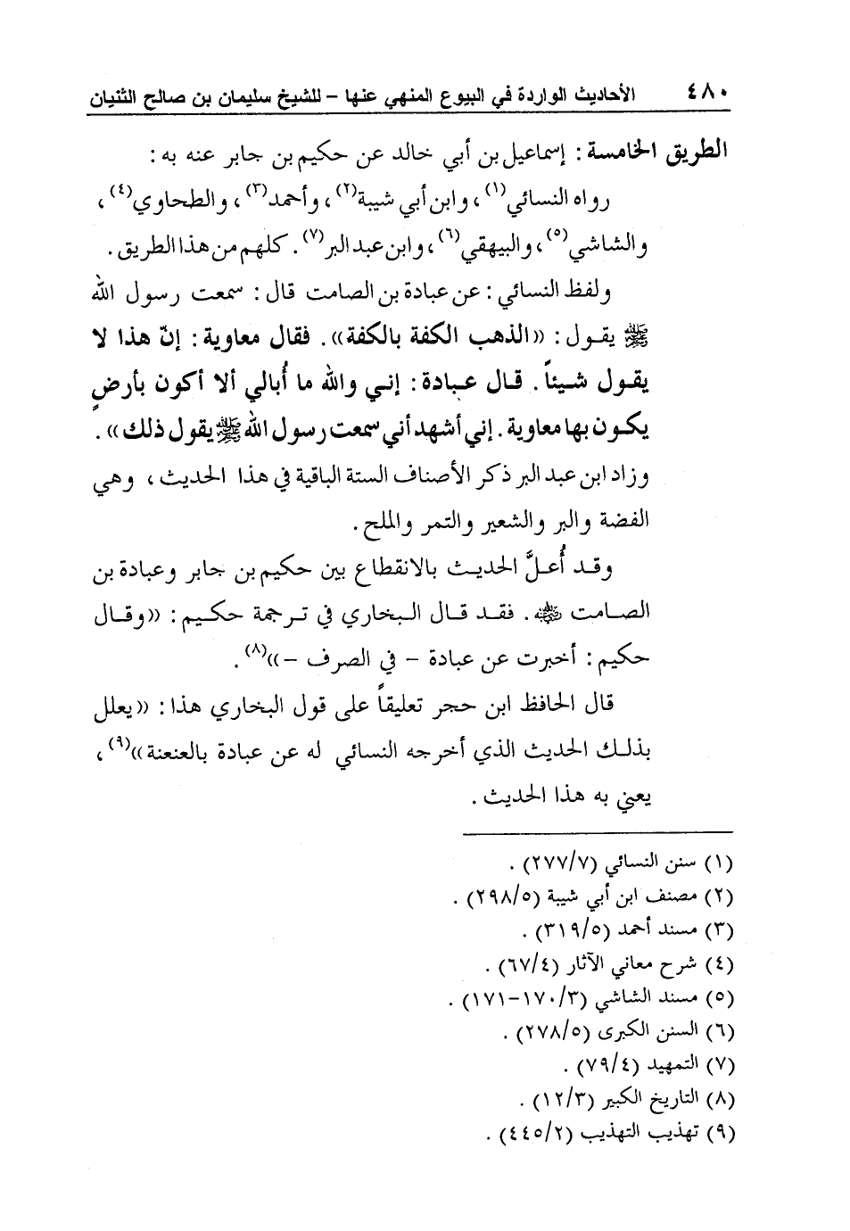 ولفظ النسائي: عن عبادة بن الصامت قال: سمعت رسول الله صلى الله عليه وسلم يقول: "الذهب الكفة بالكفة". فقال معاوية: إنّ هذا لا يقول شيئاً. قال عبادة: إني والله ما أُبالي ألا أكون بأرضٍ يكون بها معاوية. إني أشهد أني سمعت رسول الله صلى الله عليه وسلم يقول ذلك". وزاد ابن عبد البر ذكر الأصناف الستة الباقية في هذا الحديث، وهي الفضة والبر والشعير والتمر والملح.