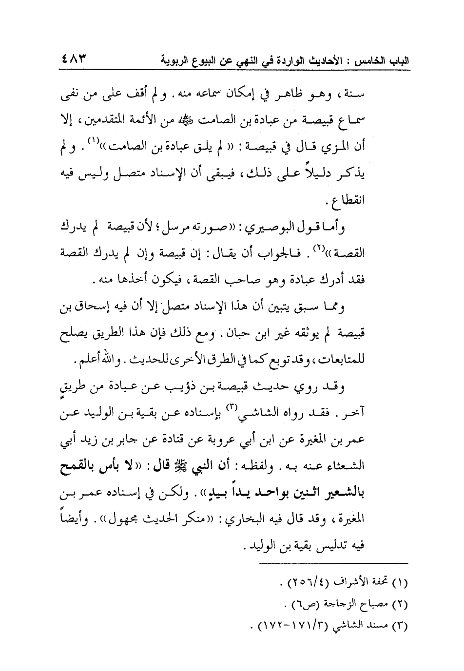 سنة، وهو ظاهر في إمكان سماعه منه. ولم أقف على من نفى سماع قبيصة من عبادة بن الصامت رضي الله عنه من الأئمة المتقدمين، إلا أن المزي قال في قبيصة: "لم يلق عبادة بن الصامت"1. ولم يذكر دليلاً على ذلك، فيبقى أن الإسناد متصل وليس فيه انقطاع.