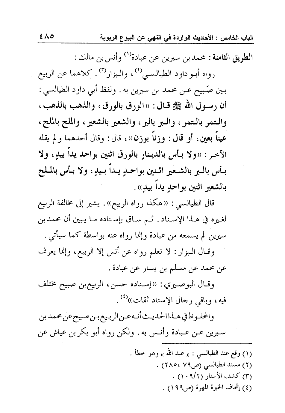 رواه أبو داود الطيالسي2، والبزار3. كلاهما عن الربيع بين صَبيح عن محمد بن سيرين به. ولفظ أبي داود الطيالسي: أن رسول الله صلى الله عليه وسلم قال: "الورق بالورق، والذهب بالذهب، والتمر بالتمر، والبر بالبر، والشعير بالشعير، والملح بالملح، عيناً بعين، أو قال: وزناً بوزن"، قال: وقال أحدهما ولم يقله الآخر: "ولا بأس بالدينار بالورق اثنين بواحد يداً بيدٍ، ولا بأس بالبر بالشعير اثنين بواحدٍ يداً بيدٍ، ولا بأس بالملح بالشعير اثنين بواحدٍ يداً بيدٍ".