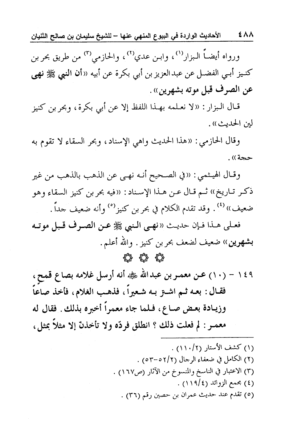 وقال الهيثمي: "في الصحيح أنه نهى عن الذهب بالذهب من غير ذكر تاريخ" ثم قال عن هذا الإسناد: "فيه بحر بن كنيز السقاء وهو ضعيف" 4. وقد تقدم الكلام في بحر بن كنيز5 وأنه ضعيف جداً.