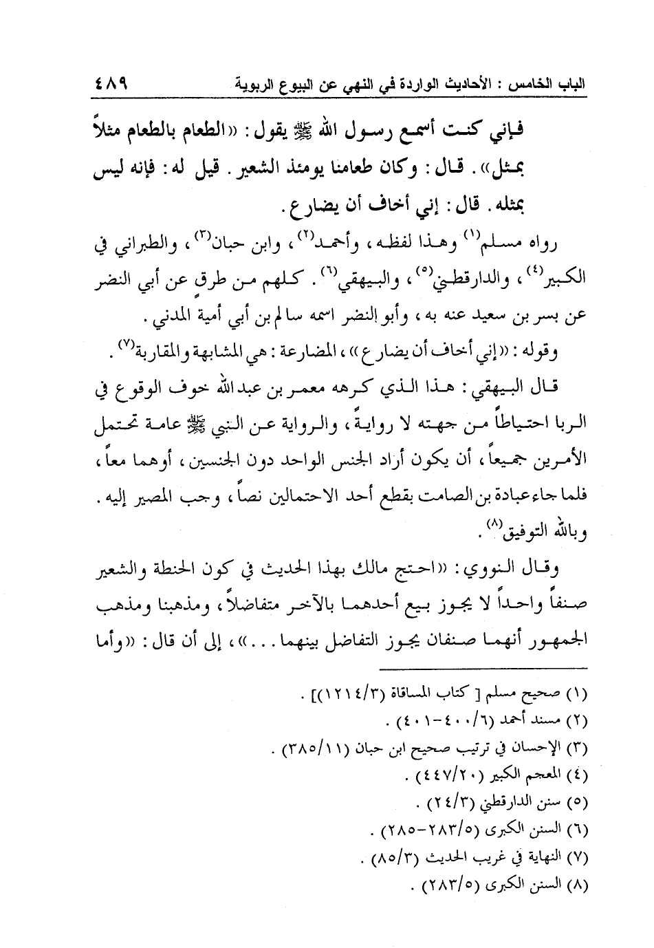قال البيهقي: هذا الذي كرهه معمر بن عبد الله خوف الوقوع في الربا احتياطاً من جهته لا روايةً، والرواية عن النبي صلى الله عليه وسلم عامة تحتمل الأمرين جميعاً، أن يكون أراد الجنس الواحد دون الجنسين، أوهما معاً، فلما جاء عبادة بن الصامت بقطع أحد الاحتمالين نصاً، وجب المصير إليه. وبالله التوفيق8.