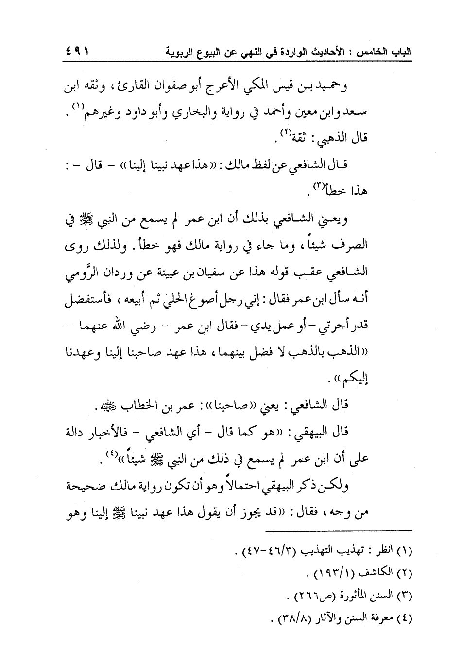 ويعني الشافعي بذلك أن ابن عمر لم يسمع من النبي صلى الله عليه وسلم في الصرف شيئاً، وما جاء في رواية مالك فهو خطأ. ولذلك روى الشافعي عقب قوله هذا عن سفيان بن عيينة عن وردان الرَّومي أنه سأل ابن عمر فقال: إني رجل أصوغ الحلي ثم أبيعه، فأستفضل قدر أجرتي - أو عمل يدي - فقال ابن عمر - رضي الله عنهما - "الذهب بالذهب لا فضل بينهما، هذا عهد صاحبنا إلينا وعهدنا إليكم".