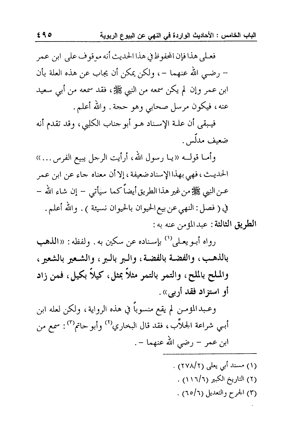 رواه أبو يعلى1 بإسناده عن سكين به. ولفظه: "الذهب بالذهب، والفضة بالفضة، والبر بالبر، والشعير بالشعير، والملح بالملح، والتمر بالتمر مثلاً بمثل، كيلاً بكيل، فمن زاد أو استزاد فقد أربى".