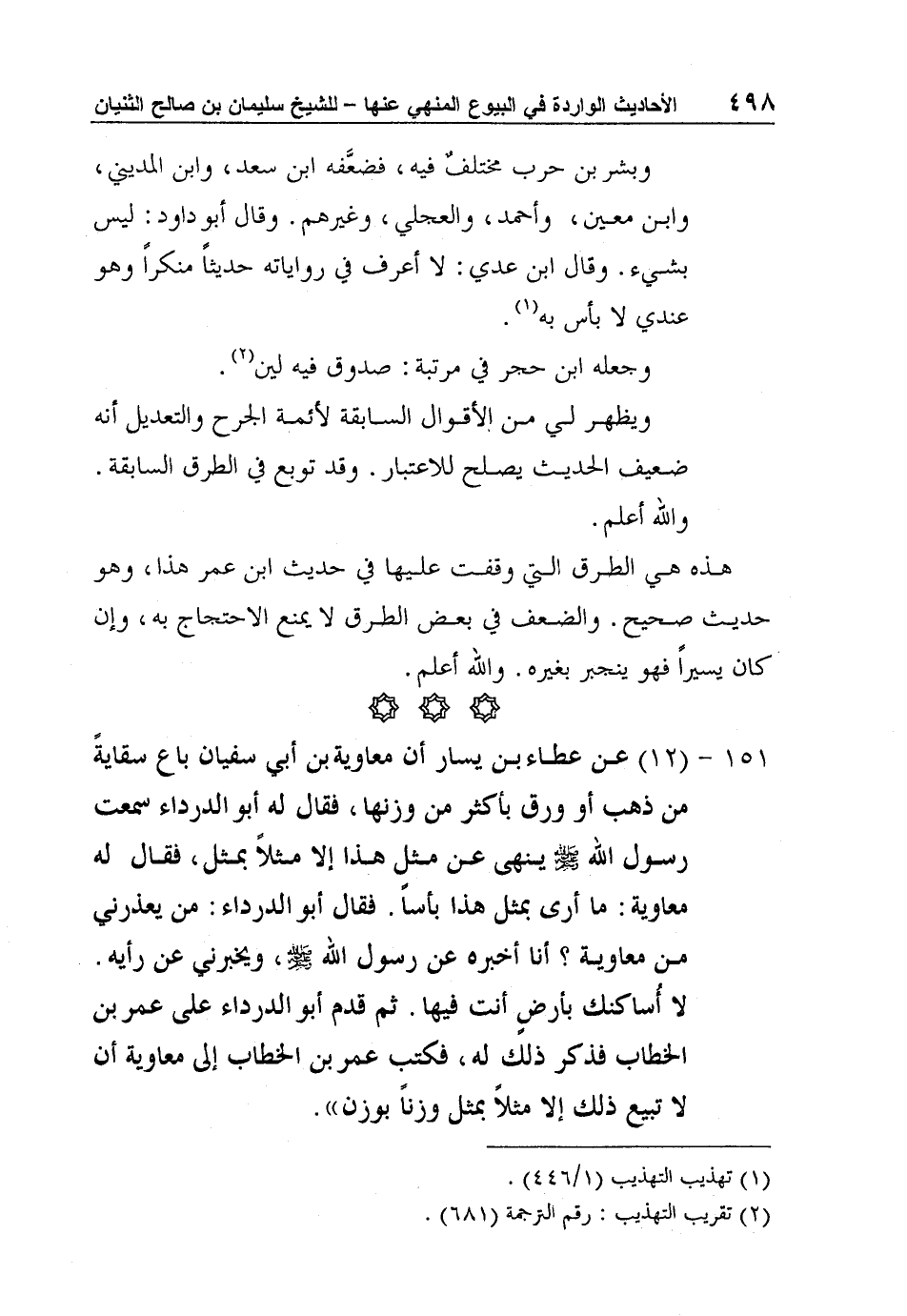 151 - (12) عن عطاء بن يسار أن معاوية بن أبي سفيان باع سقايةً من ذهب أو ورق بأكثر من وزنها، فقال له أبو الدرداء سمعت رسول الله صلى الله عليه وسلم ينهى عن مثل هذا إلا مثلاً بمثل، فقال له معاوية: ما أرى بمثل هذا بأساً. فقال أبو الدرداء: من يعذرني من معاوية؟ أنا أخبره عن رسول الله صلى الله عليه وسلم، ويخبرني عن رأيه. لا أُساكنك بأرضٍ أنت فيها. ثم قدم أبو الدرداء على عمر بن الخطاب فذكر ذلك له، فكتب عمر بن الخطاب إلى معاوية أن لا تبيع ذلك إلا مثلاً بمثل وزناً بوزن".