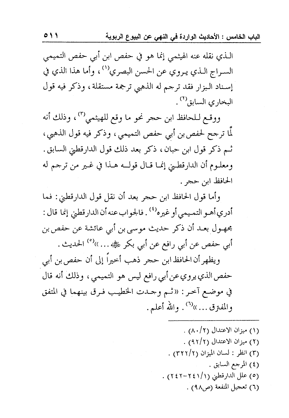 وأما قول الحافظ ابن حجر بعد أن نقل قول الدارقطني: فما أدري أهو التميمي أو غيره4. فالجواب عنه أن الدارقطني إنما قال: مجهول بعد أن ذكر حديث موسى بن أبي عائشة عن حفص بن أبي حفص عن أبي رافع عن أبي بكر رضي الله عنه ... "5 الحديث.