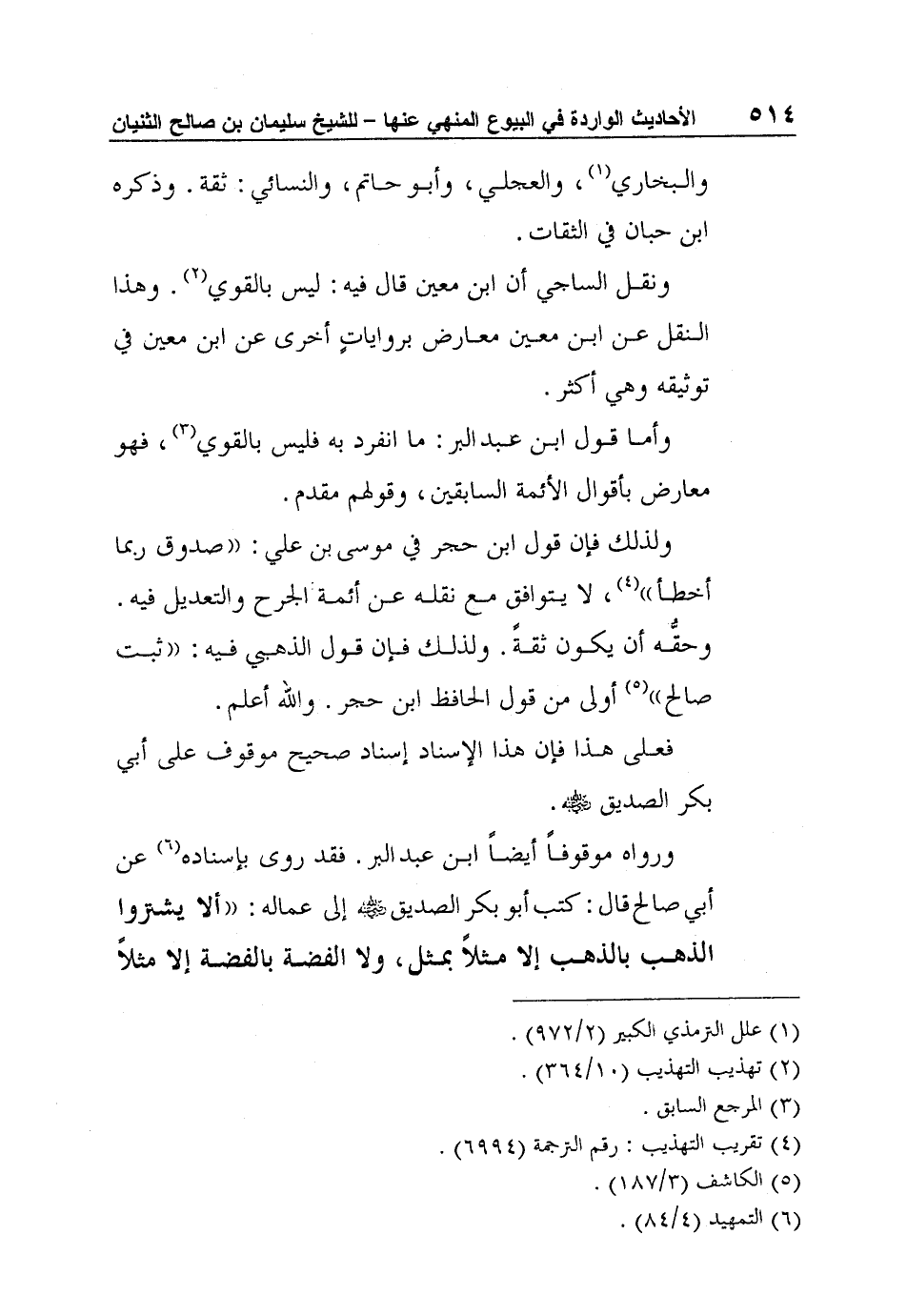 ورواه موقوفاً أيضاً ابن عبد البر. فقد روى بإسناده6 عن أبي صالح قال: كتب أبو بكر الصديق رضي الله عنه إلى عماله: "ألا يشتروا الذهب بالذهب إلا مثلاً بمثل، ولا الفضة بالفضة إلا مثلاً