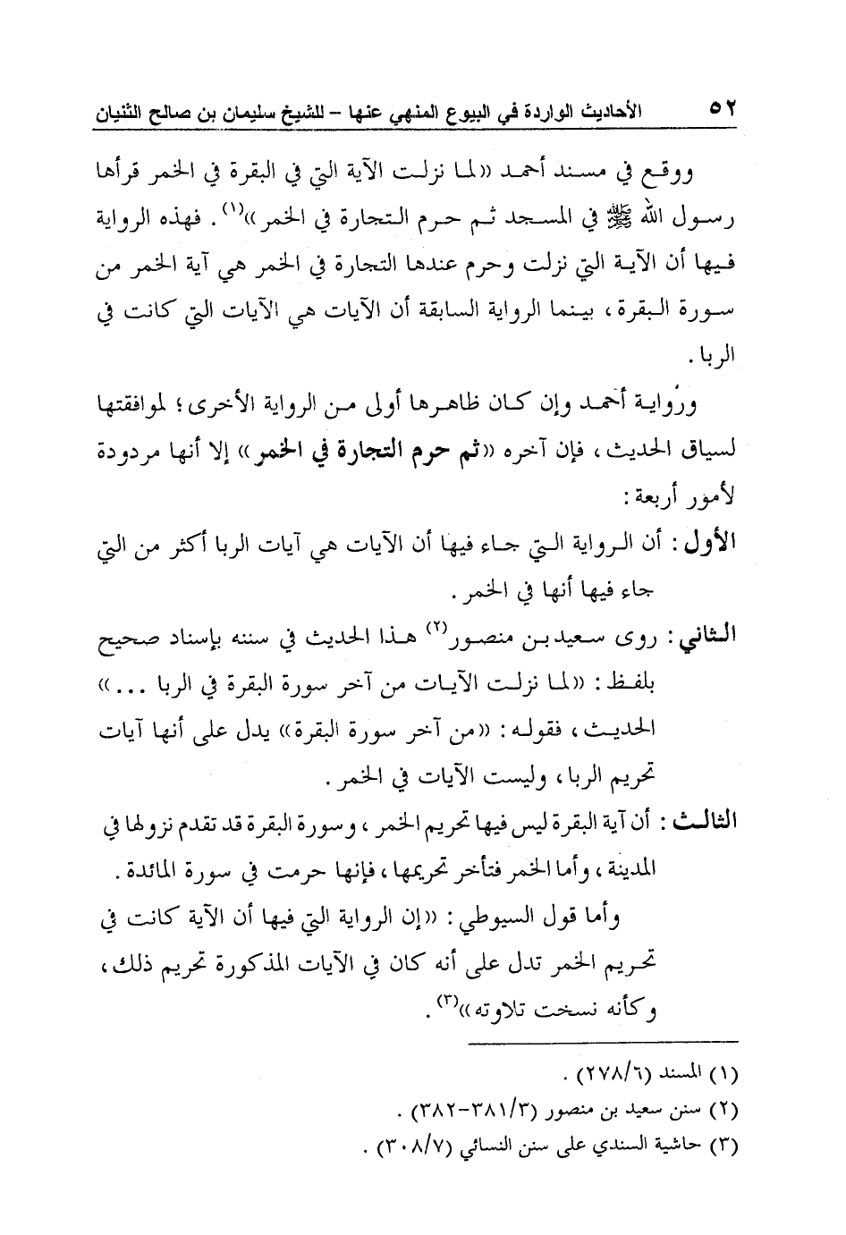 ووقع في مسند أحمد " لما نزلت الآية التي في البقرة في الخمر قرأها رسول الله صلى الله عليه وسلم في المسجد ثم حرم التجارة في الخمر"1. فهذه الرواية فيها أن الآية التي نزلت وحرم عندها التجارة في الخمر هي آية الخمر من سورة البقرة، بينما الرواية السابقة أن الآيات هي الآيات التي كانت في الربا.
